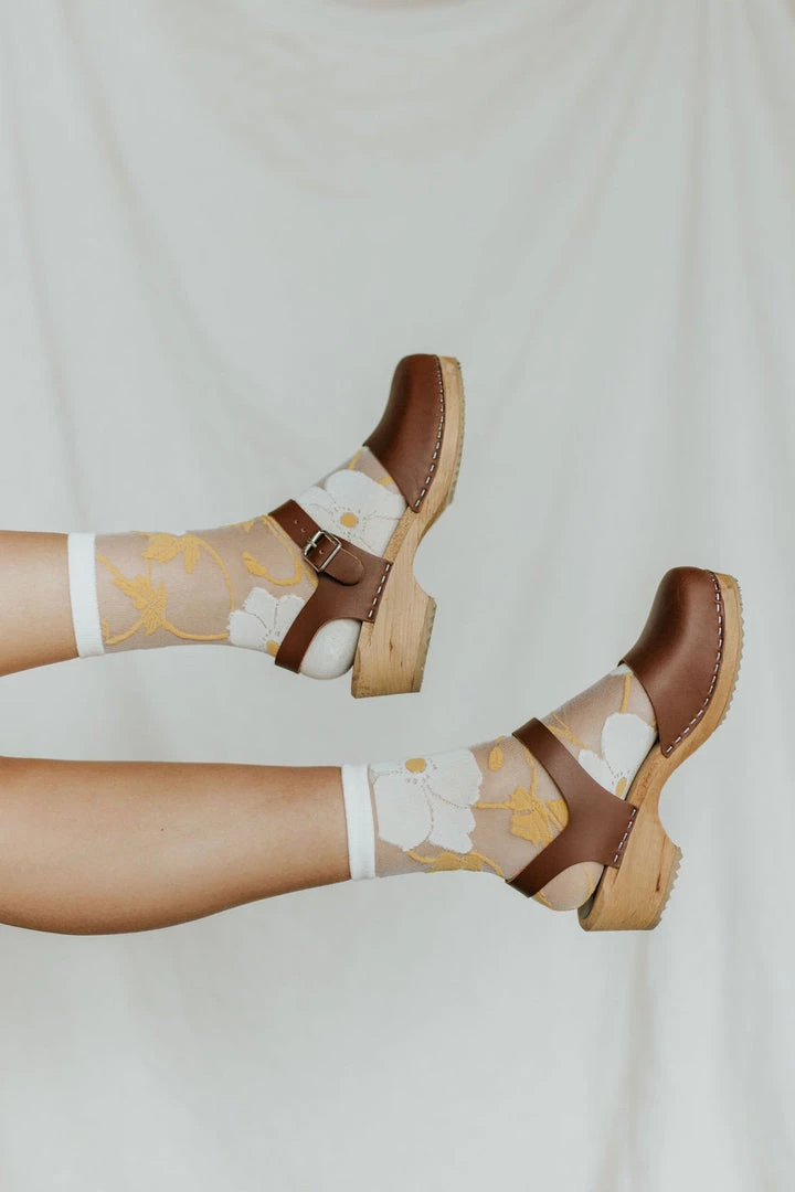 Partly sheer socks with colorful details. Soft sock bottom. Ribbed white cuff.