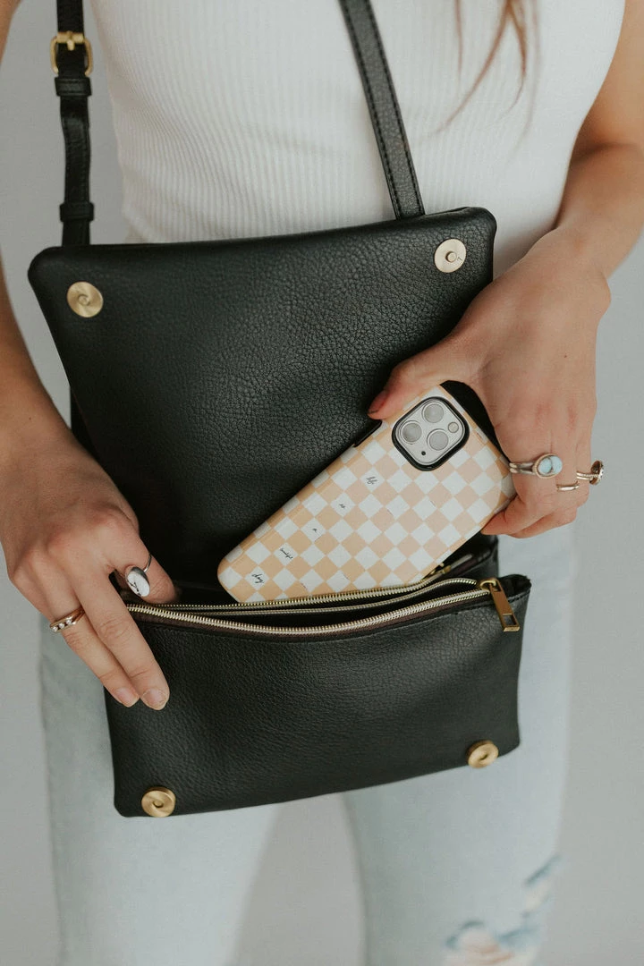 Front snap flap crossbody purse. Top zipper pocket. Under flap has two zipper pockets and two open pockets.