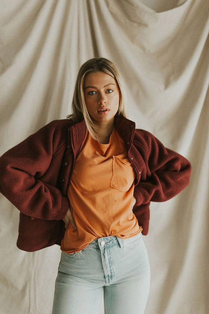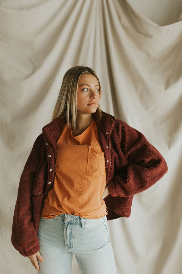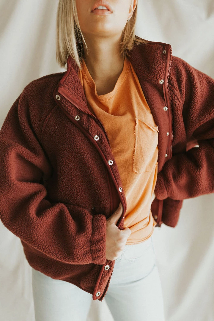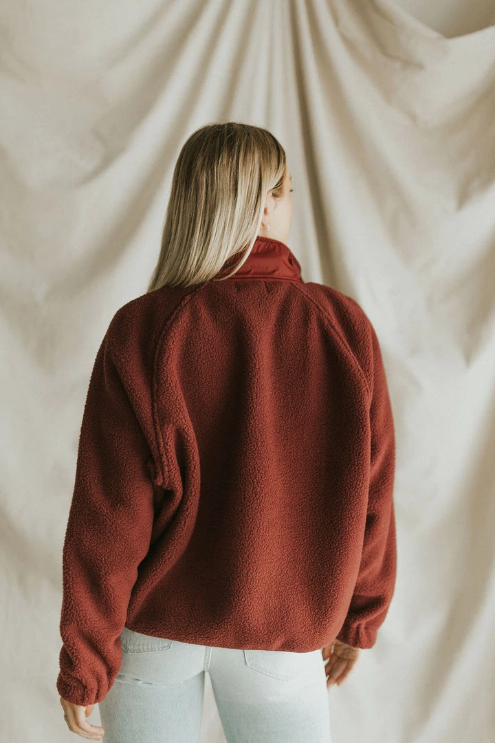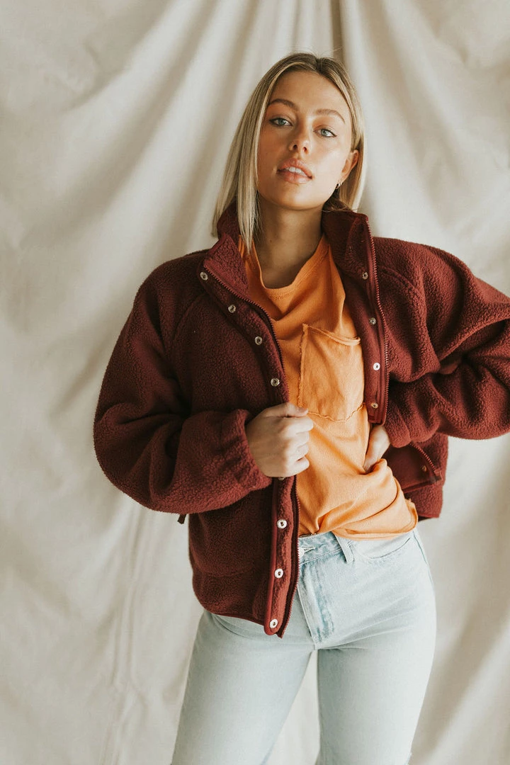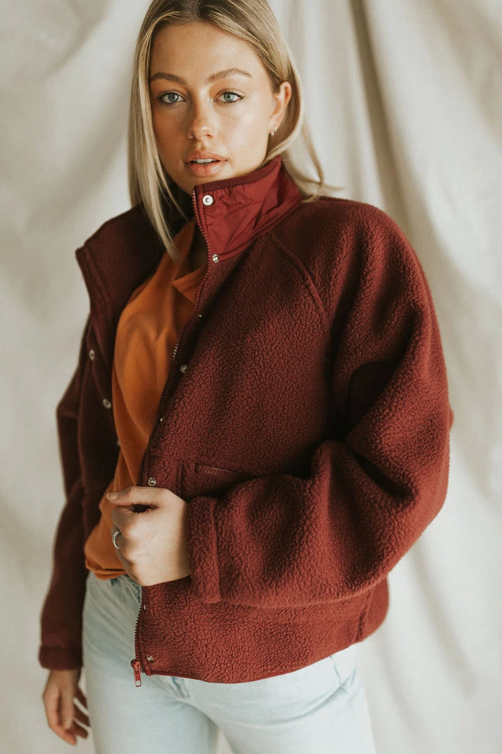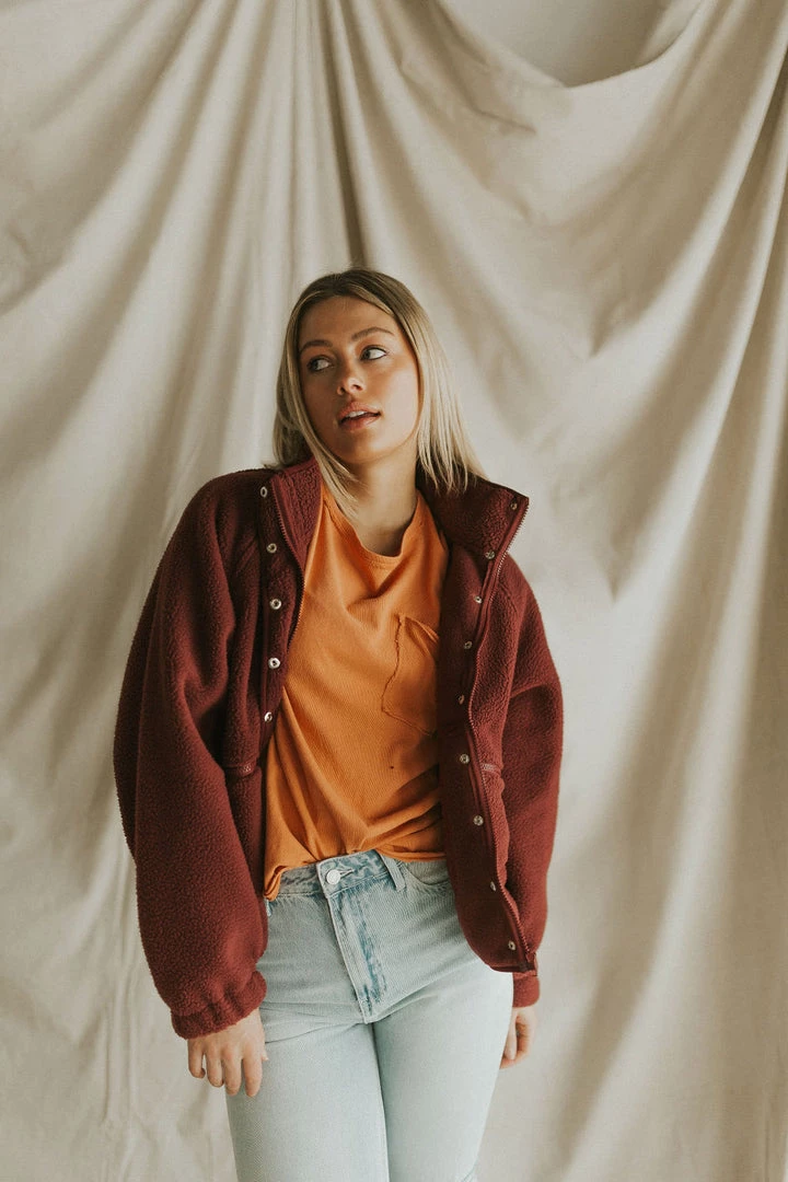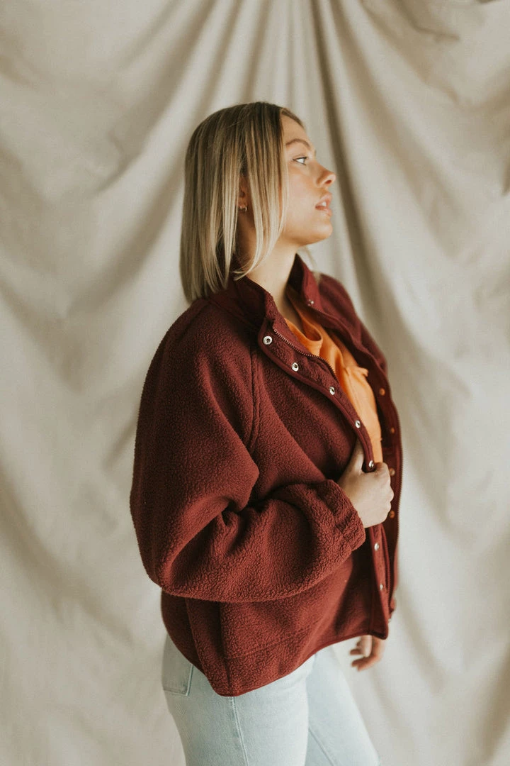 Drop shoulder sherpa in burgundy. Oversize fit. Snap front with mock neck. Zipper front pockets.