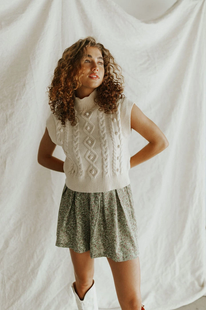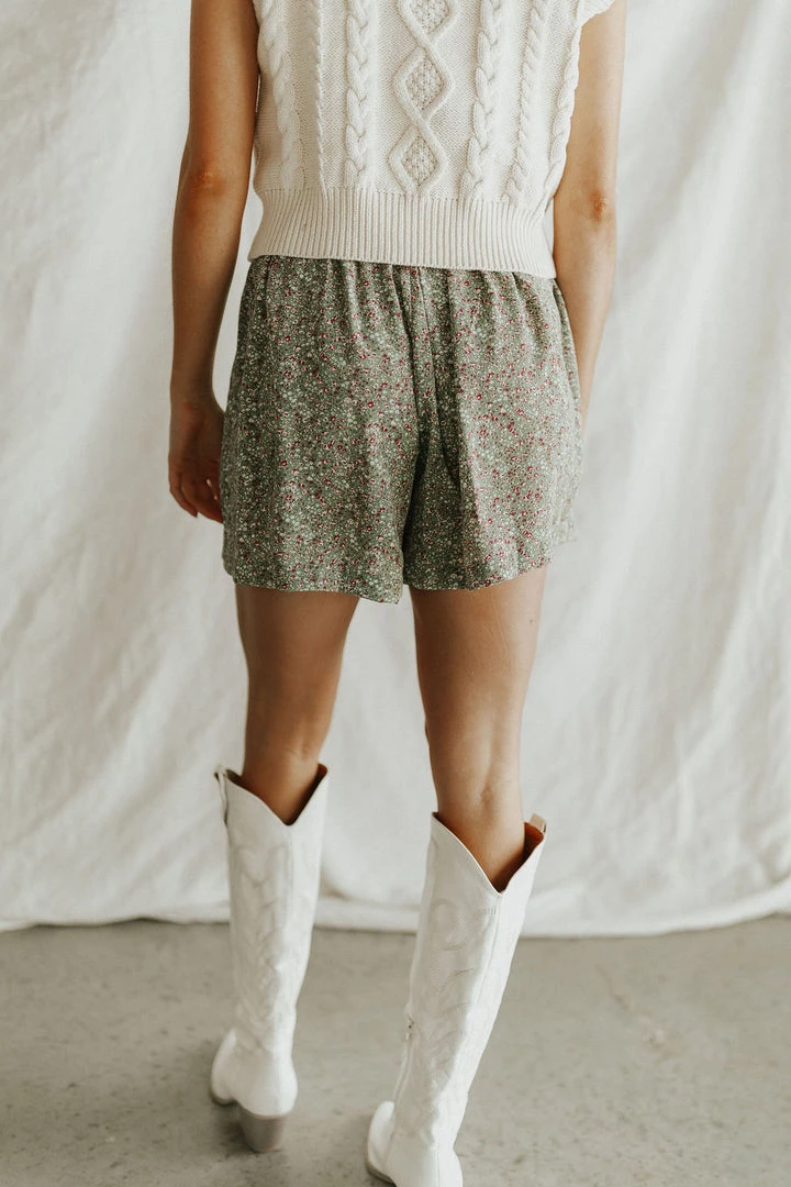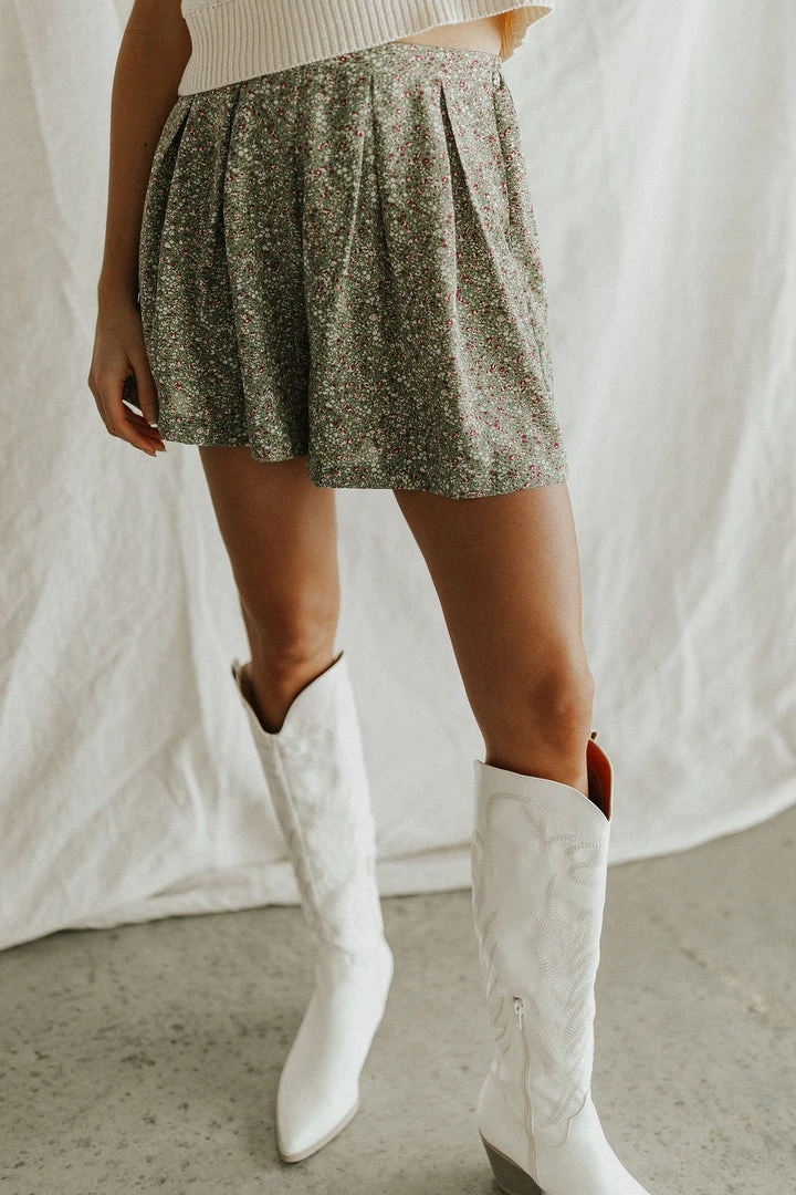 Ditsy floral print shorts. Elastic back waistband with pleated front. Size zipper closure. Side pockets. Available in multiple colors. Â