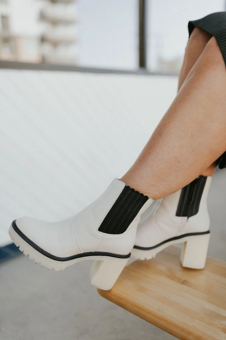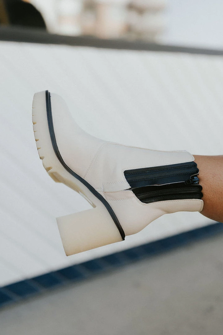 Chelsea platform boot in beige and black with elastic side and inside zip for added comfort and easy in and out. 3.25″ rubber heel.Â