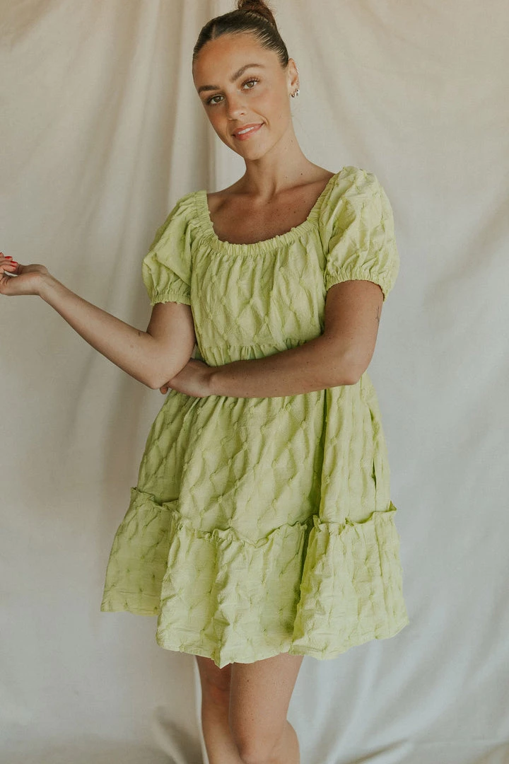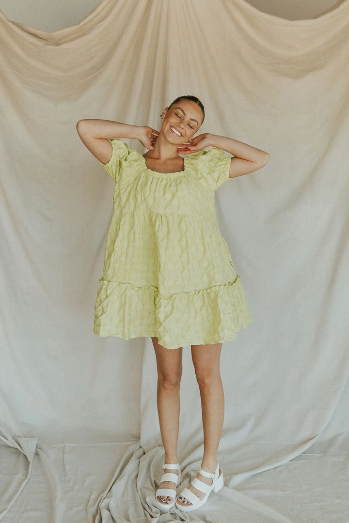 Lime sherbet textured dress. Elastic shoulders can be worn on or off the shoulder. Textured fabric Dress lined. Available in multiple colors. Nursing friendly
