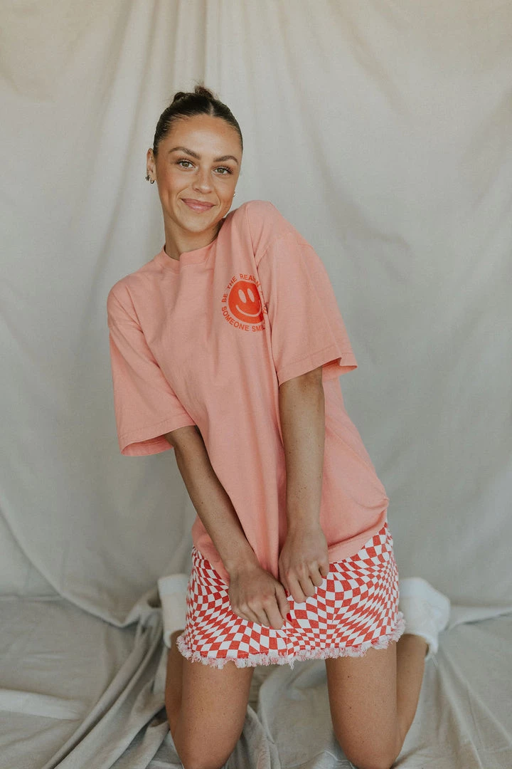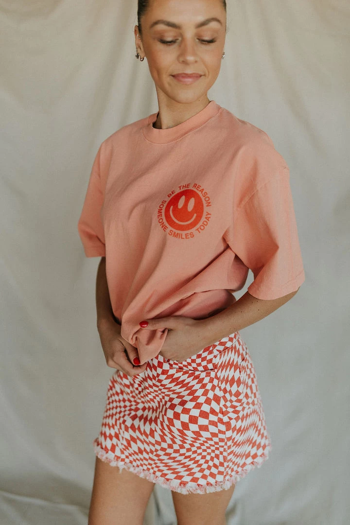 Graphic print tube tee in salmon. Graphic print of “Be the reason someone smiles today.” on front and back in red print.