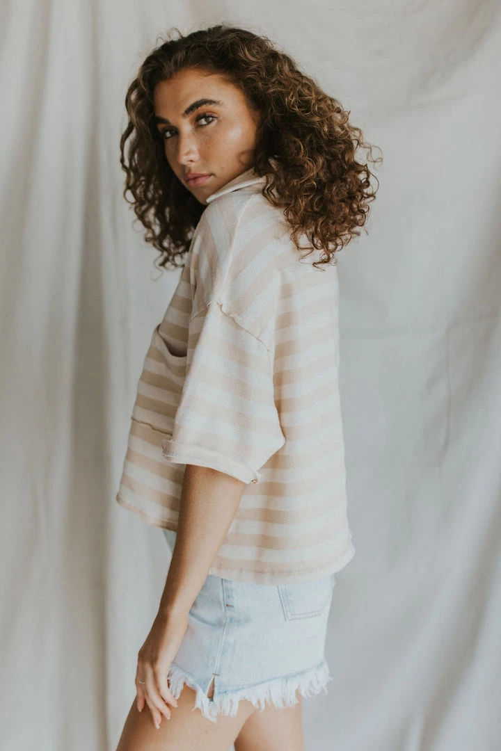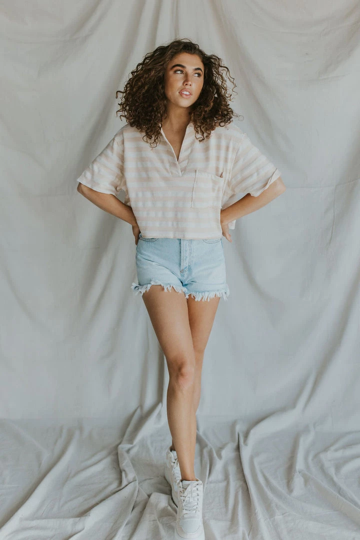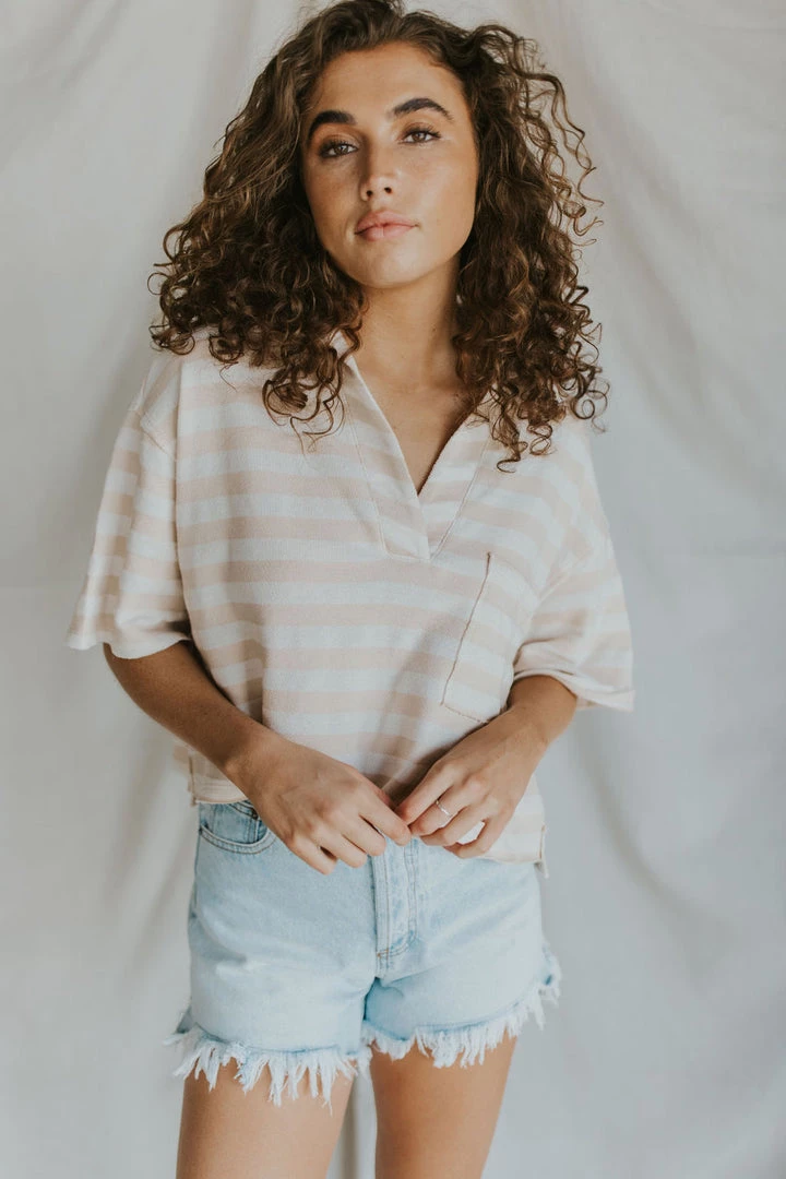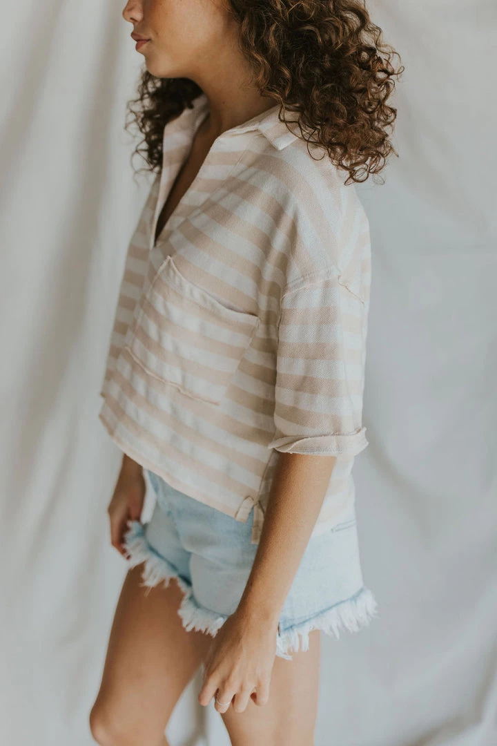 Ribbed v-neck blouse. Collared top with front pocket. Raw hem detail. MADE IN THE USA!!