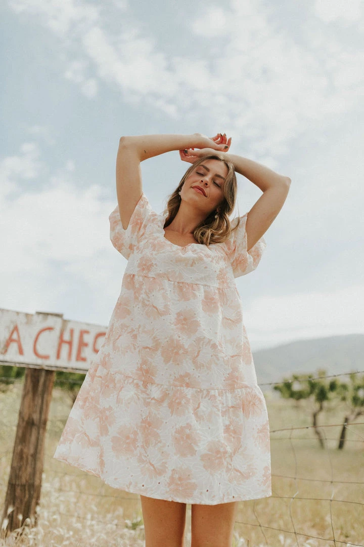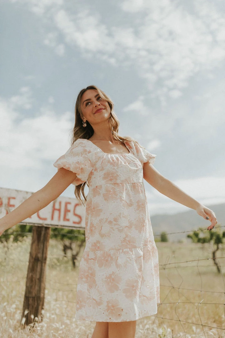 Embroidered dress in peach. Delicate flower print. Bubble sleeves. Dress lined. Elastic neck can be worn on or off the shoulder. Eyelet lace peek a boo throughout dress. Nursing friendly