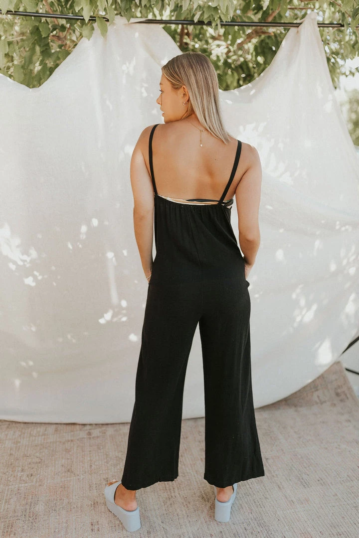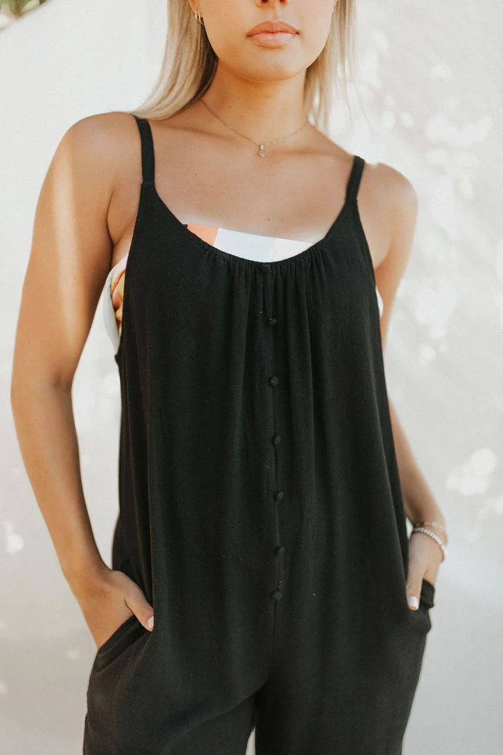 Wide leg linen blend jumpsuit in black. Faux front buttons. Side pockets. Flowy and oversized draped fit.