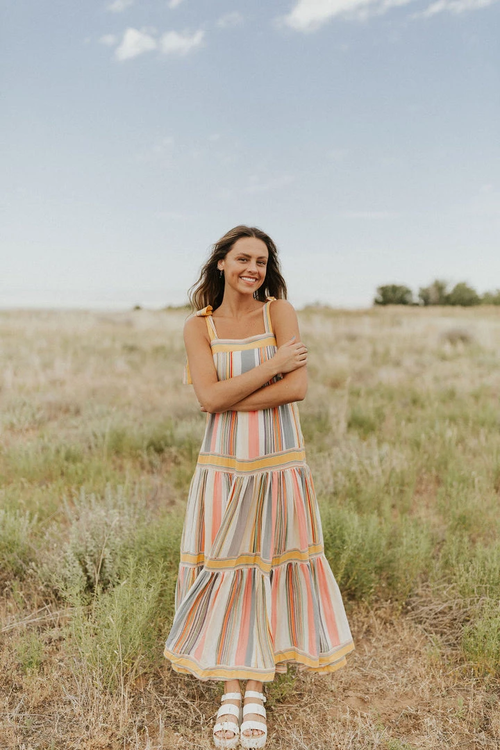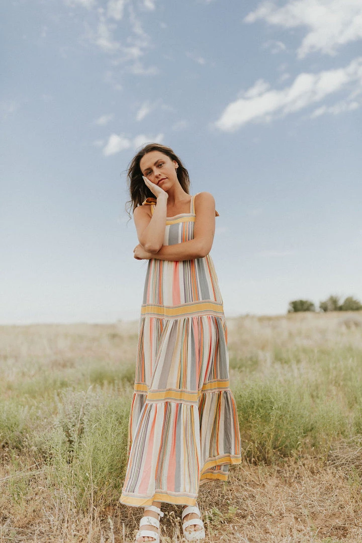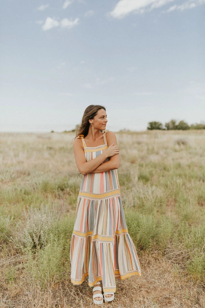 Stripe maxi in bright colors. Adjustable tie straps. Smocked back with zipper closure. Tiered skirt with contrasting stripes. Skirt lined.