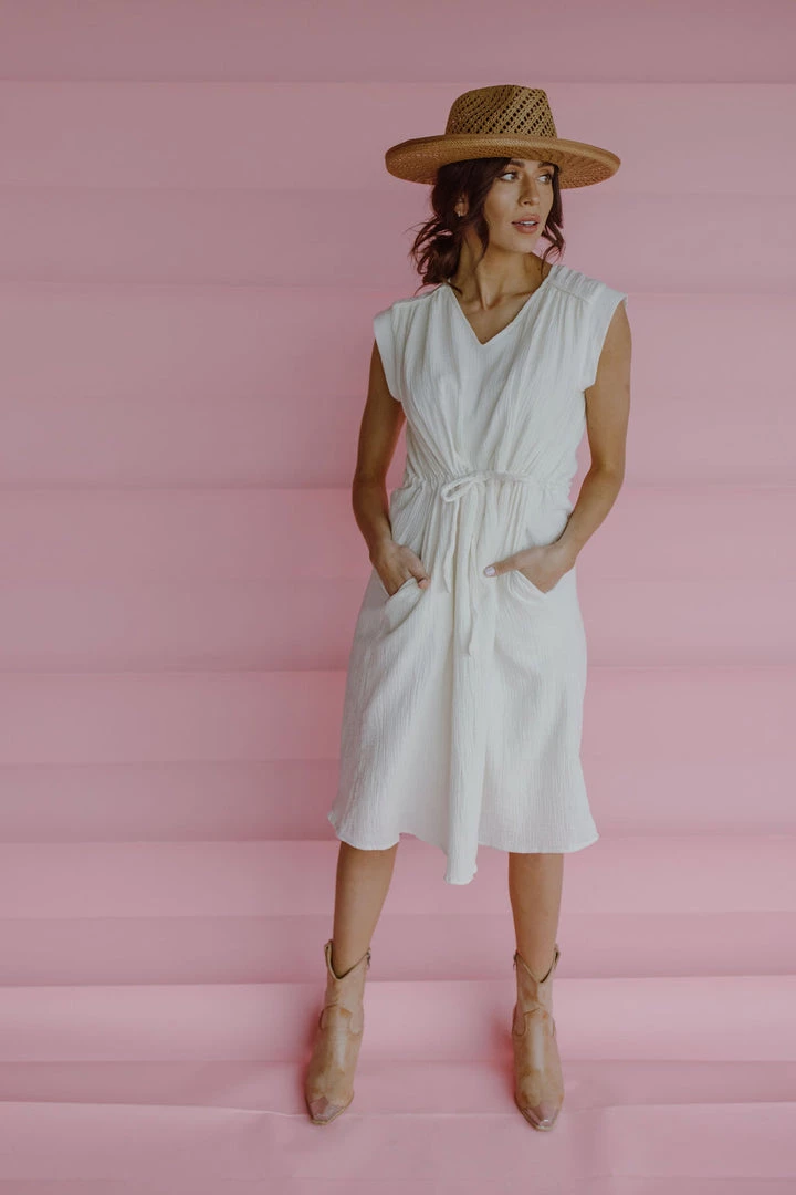 Gauze shift dress. Tie at waist. Side pockets. Dress lined.