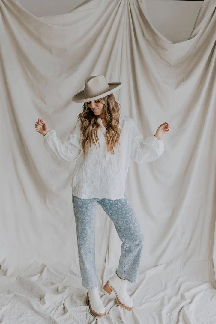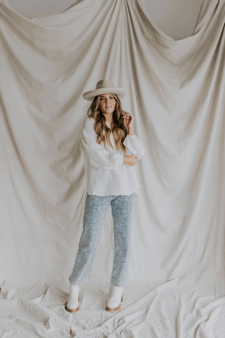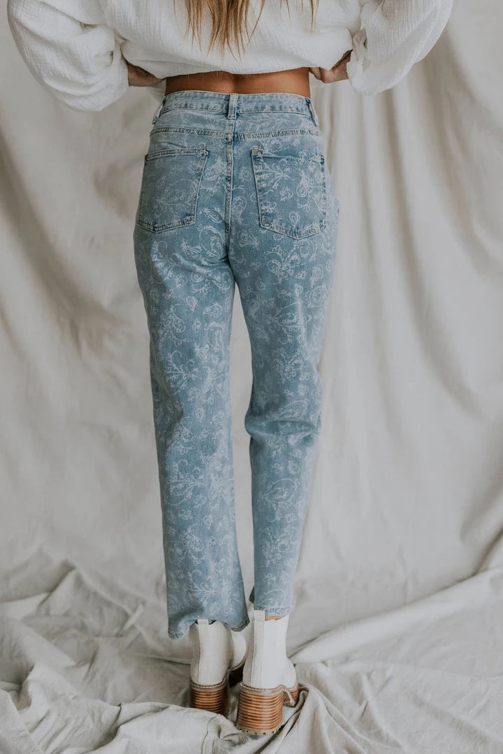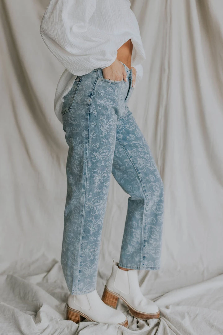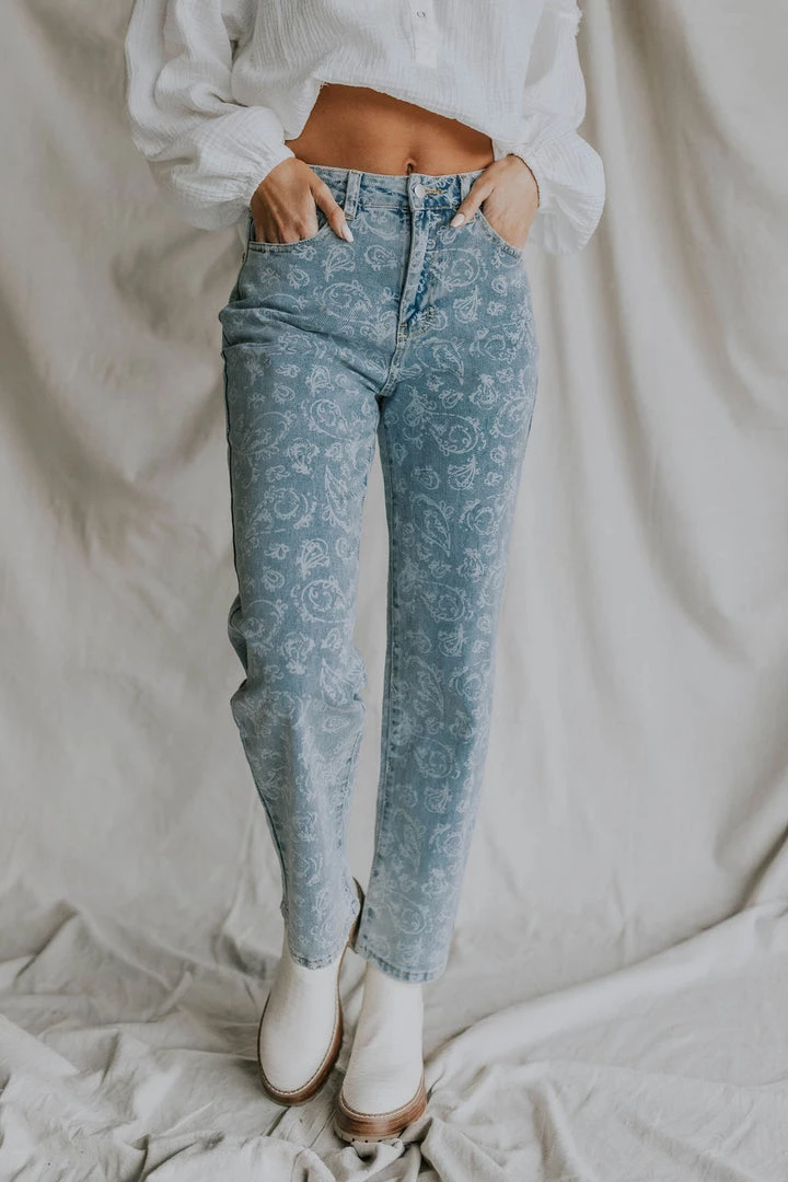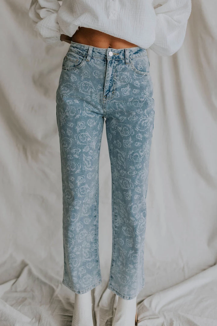 Denim pants with faint white paisley print. Soft washed look and feel.Â