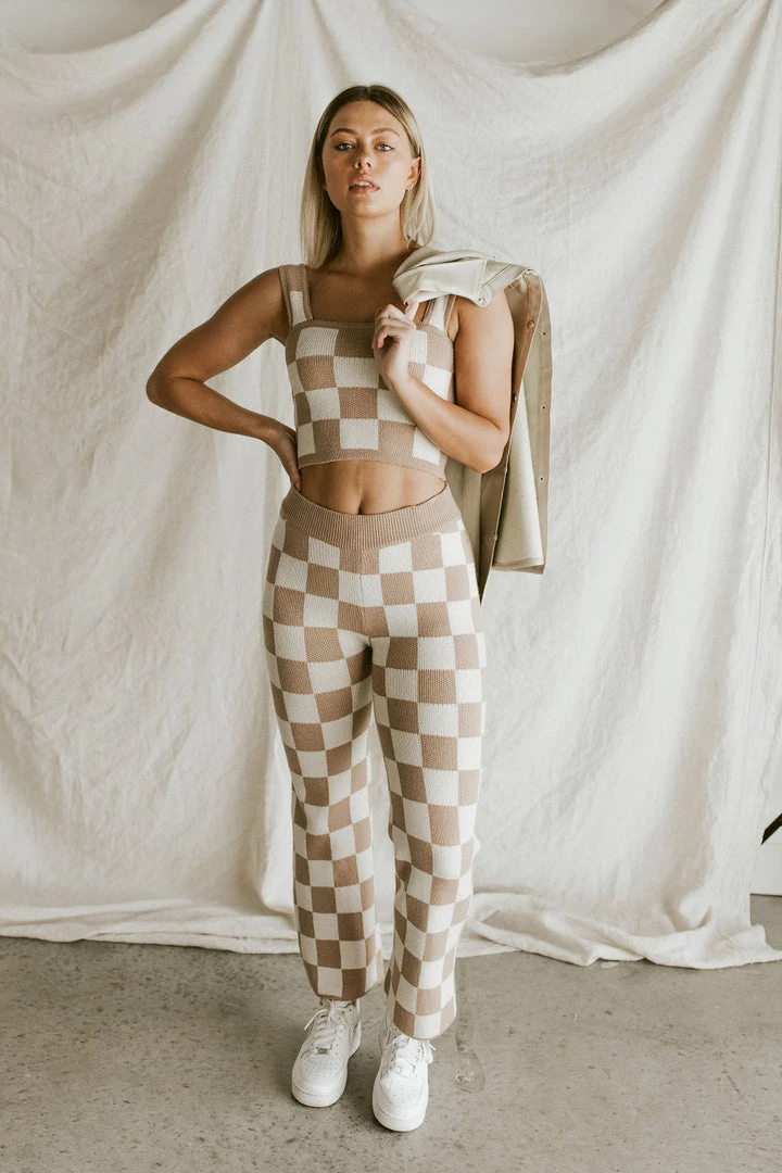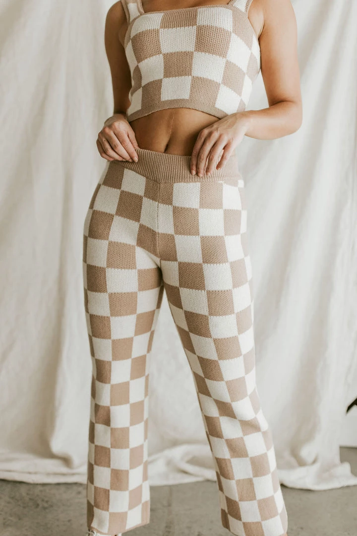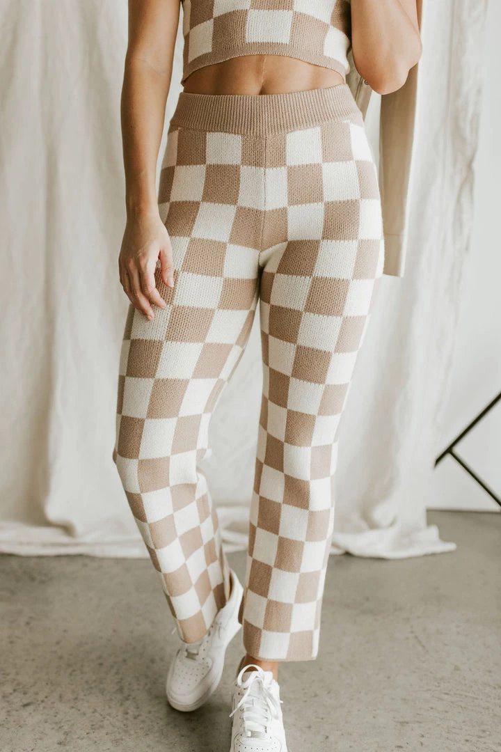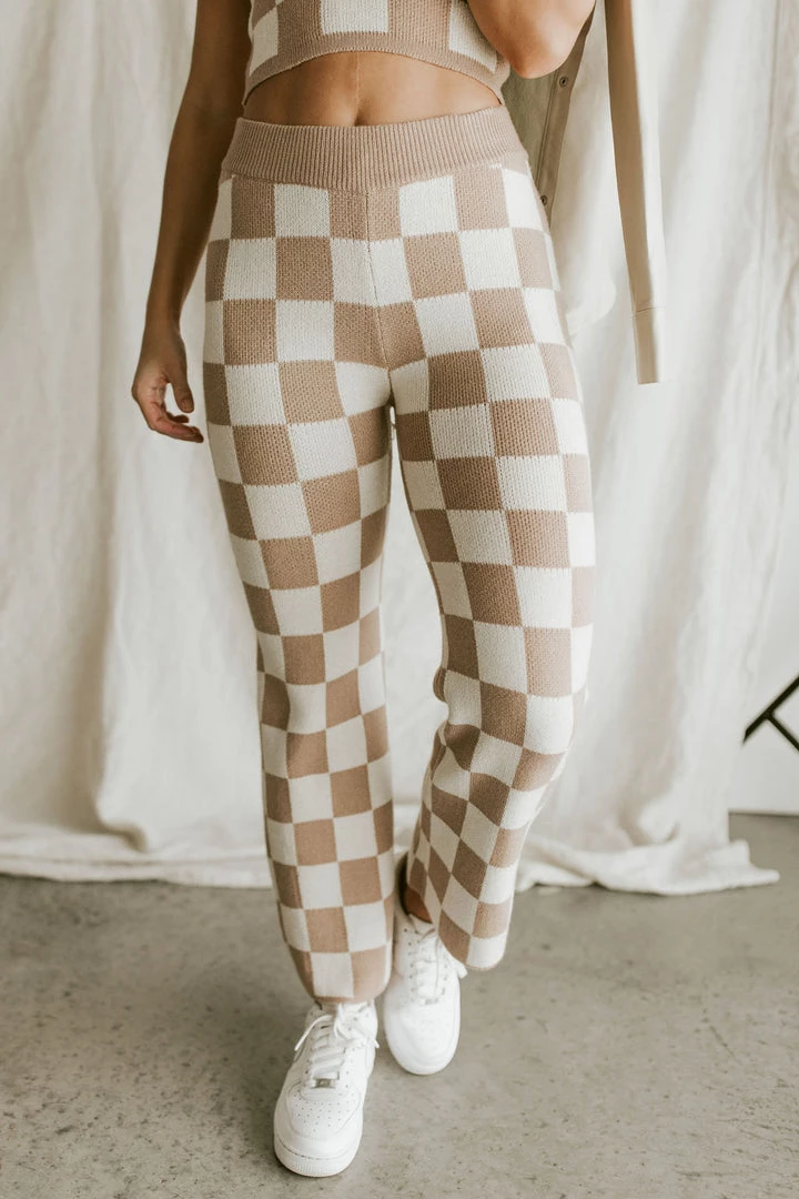 Checkered sweater pants. Super soft with tons of stretch. Straight leg. Pair perfectly with the Checkmate Sweater Crop in Taupe.