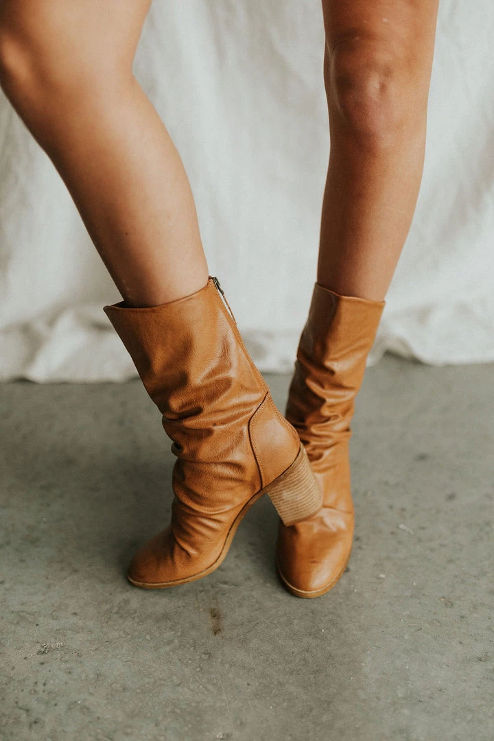 Slouched boot in camel with zipper in back for added comfort and easy in and out