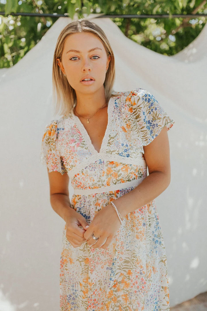 Floral chiffon midi. Low v neck. Lace detail. SIngle button closure in back. Side zipper. Ruffle skirt detail. Dress lined.