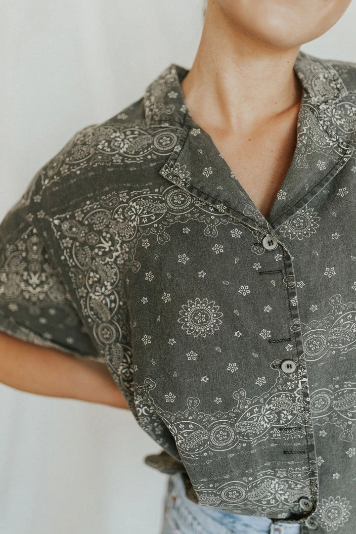 Bandana print double button down top in washed black. Cuffed sleeves. Runs big.