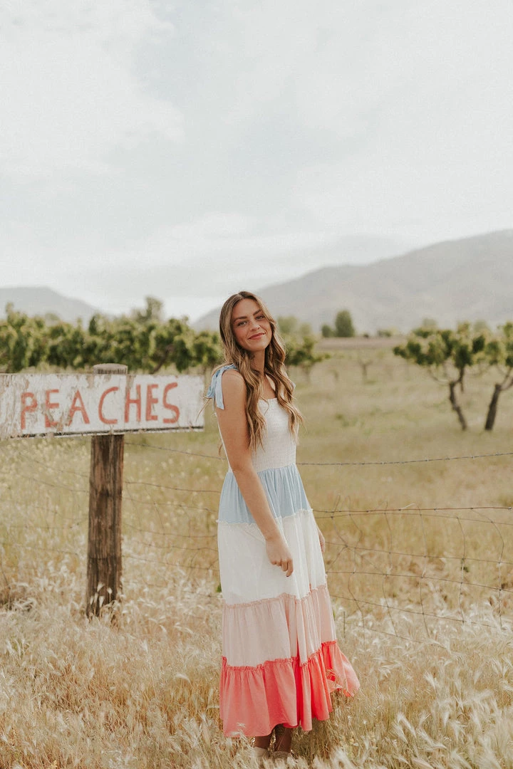 Woven color block maxi dress. Tied shoulder straps with smocked top. Ruffle details on tiered skirt. Soft rayon fabric. Skirt fully lined. Nursing friendly!