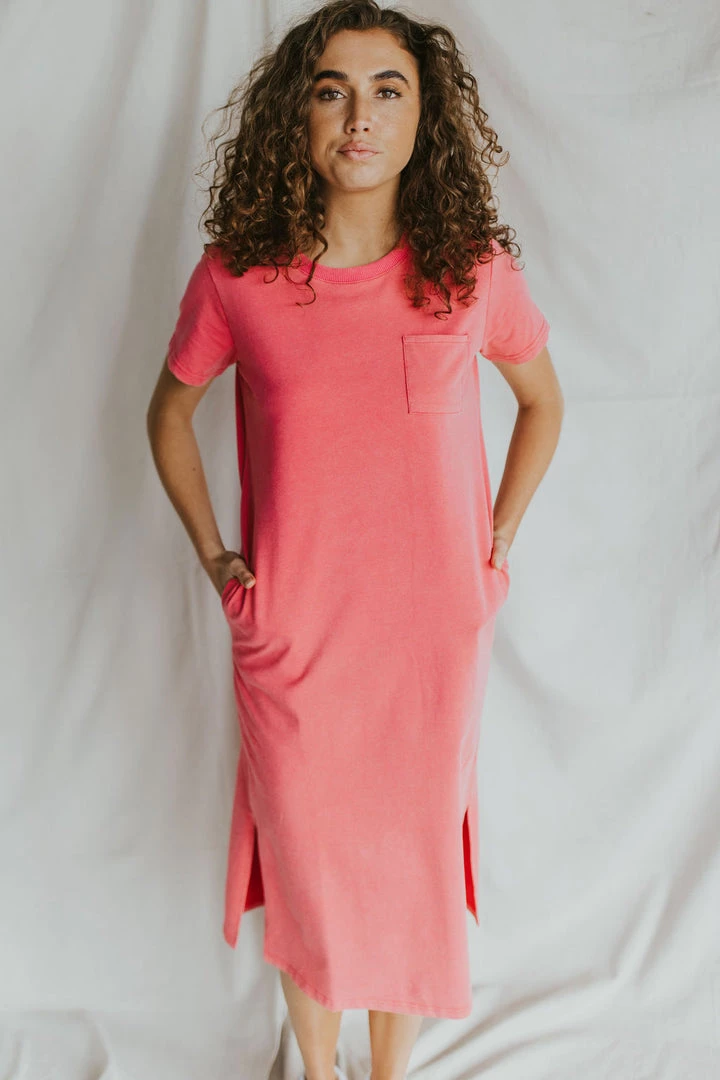 Tee dress with ribbed neck. Front chest pocket. Super soft fabric with lots of stretch. 9″ slits in sides of skirt. Available in multiple colors. Â
