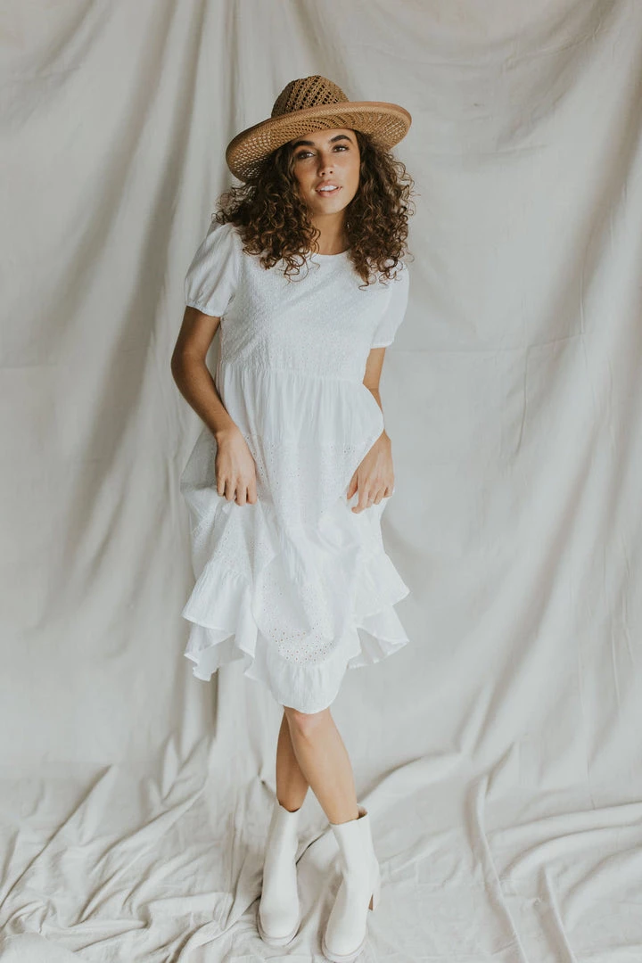 Eyelet lace tiered midi. Single button closure in back. Soft gauze fabric. Available in multiple colors. Â