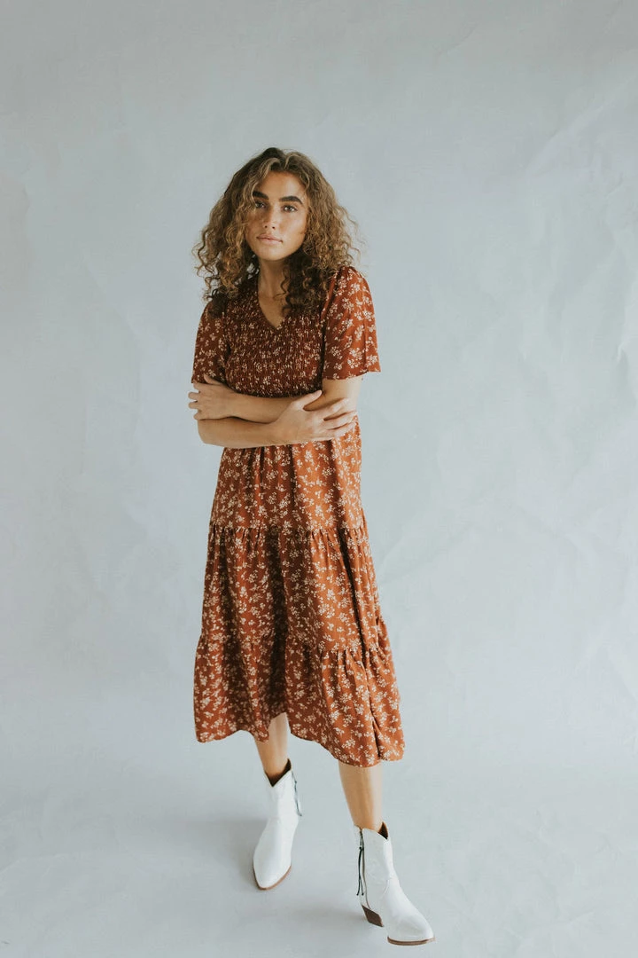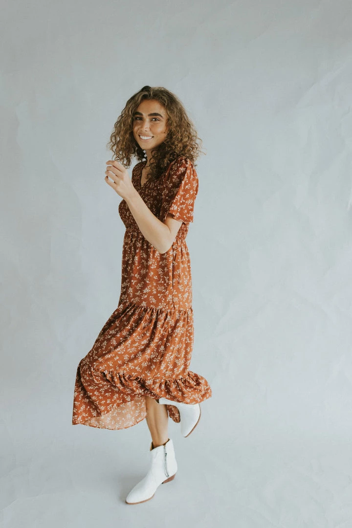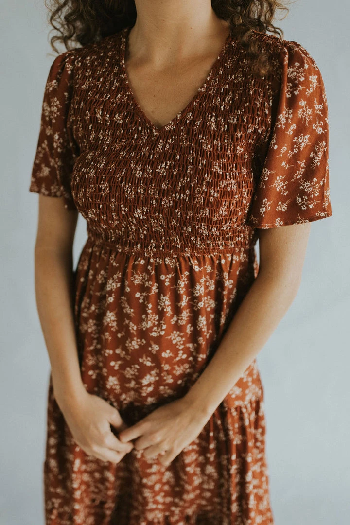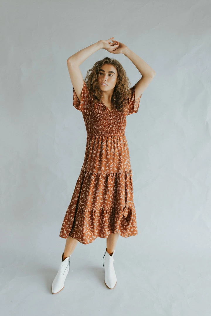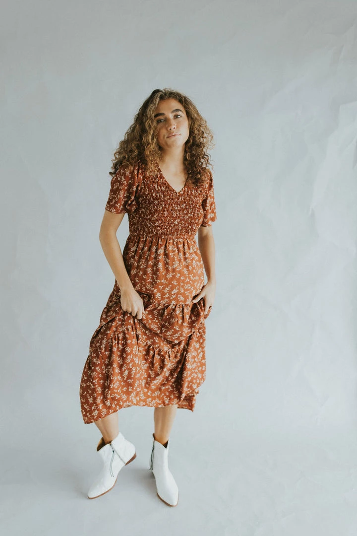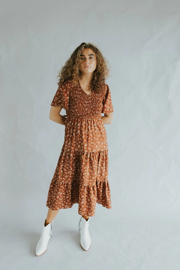 Smocked v-neck midi. Flutter sleeve detail. Lots of stretch in the body. Side pockets with tiered ruffle skirt. Skirt is lined. Available in multiple colors. Â