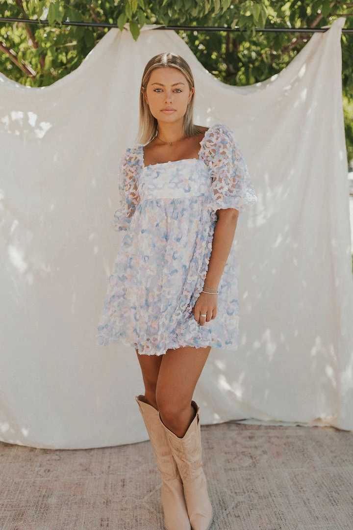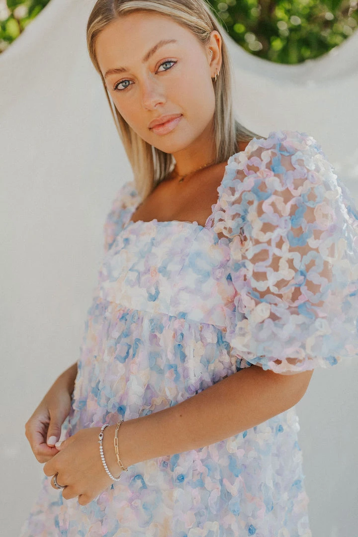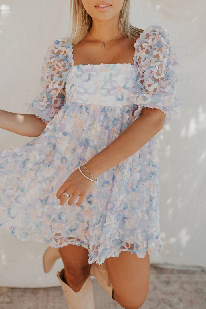 Mini dress with multi color ribbon sewn detail throughout. Square neck with elastic sheer sleeves. Can be worn on or off shoulder. Zipper back closure. Body lined.