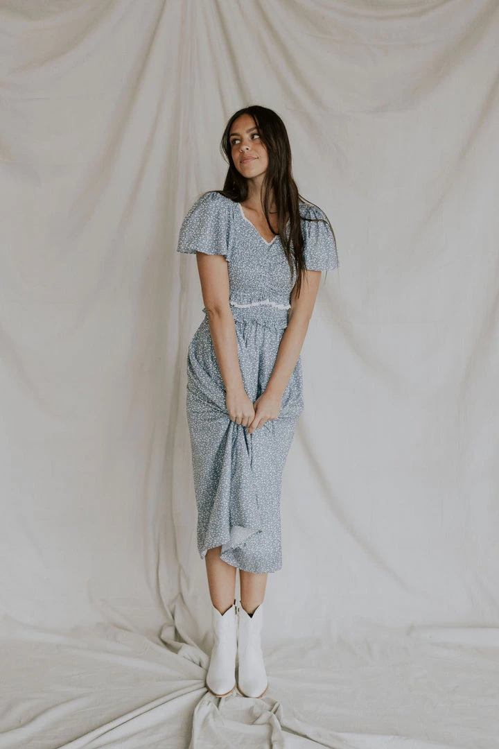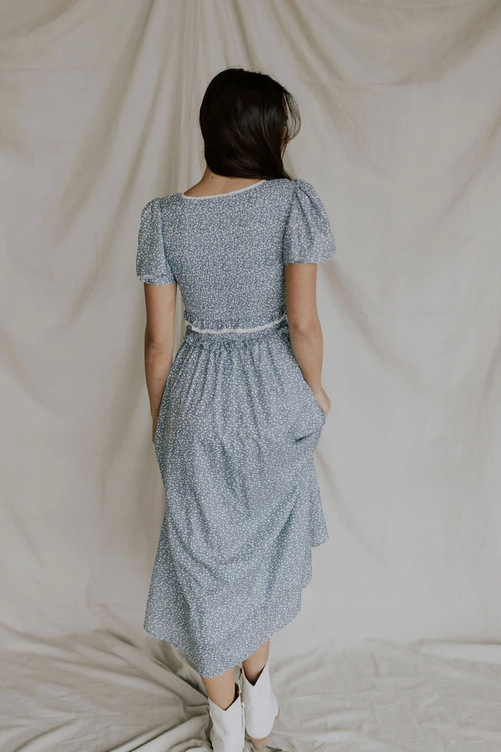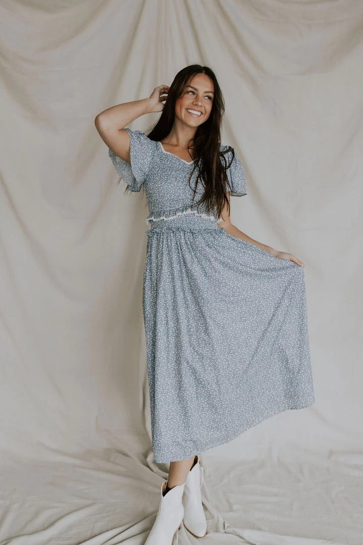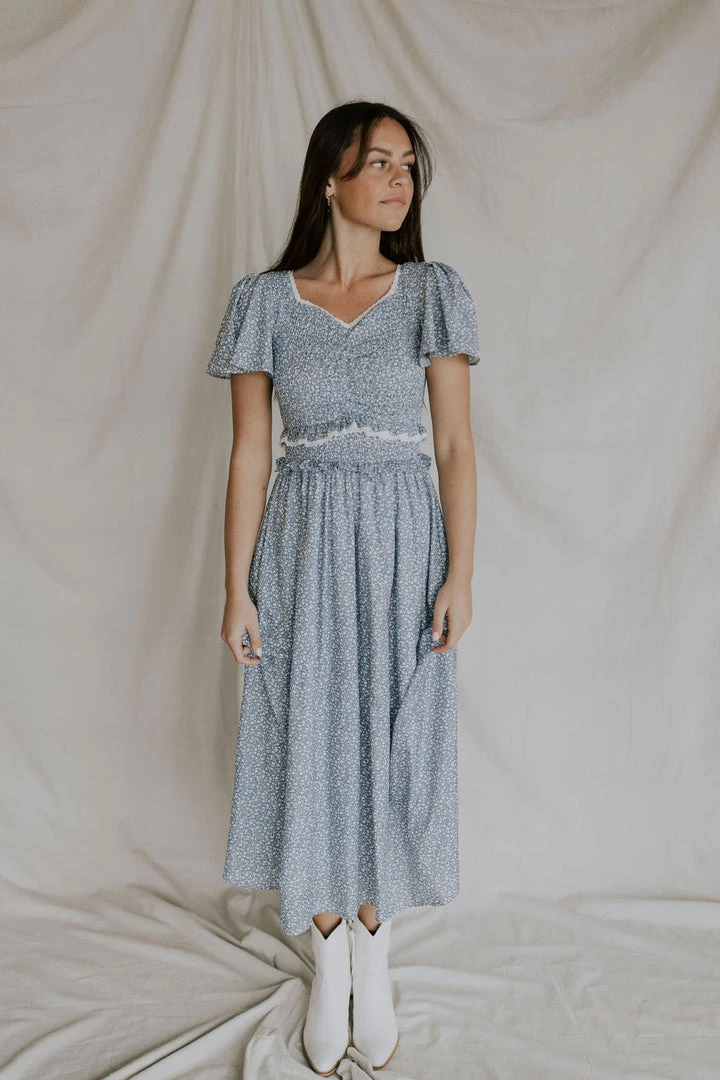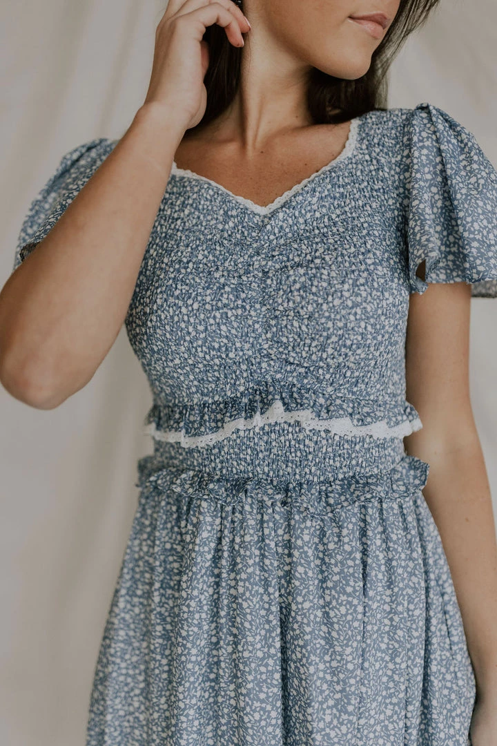 Smocked bust dress in dusty blue. Sweetheart neckline with lace trim. Ruffles with lace around the waist. Skirt lined.