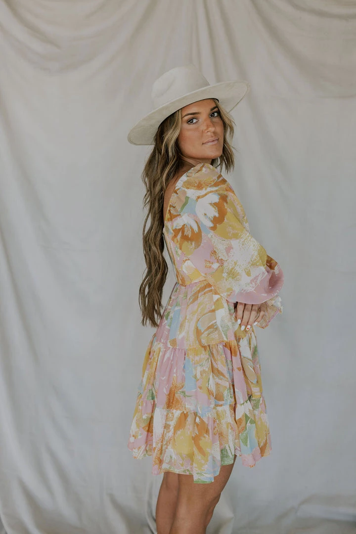 Floral midi. Slight v in neckline. Elastic sleeves can be worn on or off the shoulder. Puff sheer sleeves. Lots of stretch in the body. Flowy tiered skirt. Skirt lined. Nursing friendly!
