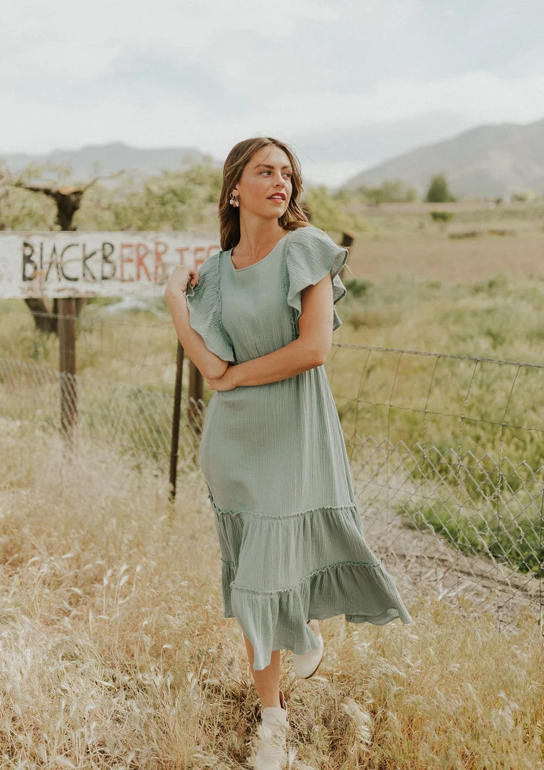 Dark sage gauze dress with ruffle details. Elastic waistband. Bib front. Pockets.