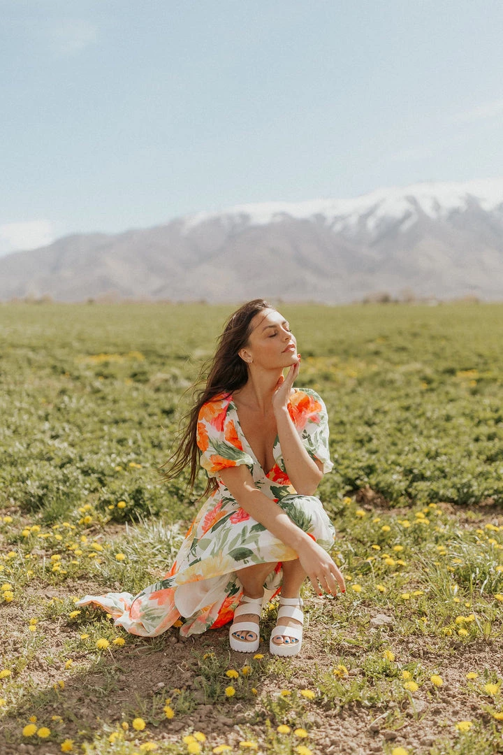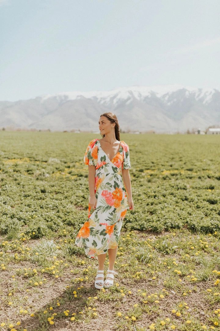 Low v neck floral midi. Bright floral print. Soft draping fabric with lining. Puff sleeves. Elastic back waistband. Â