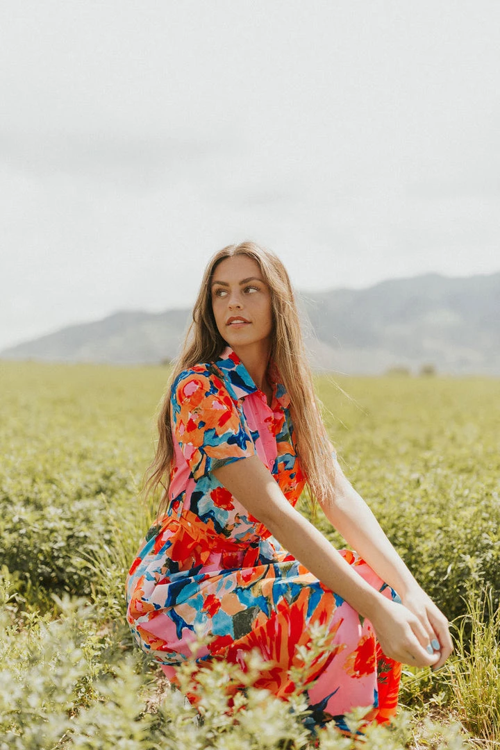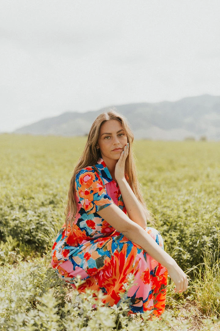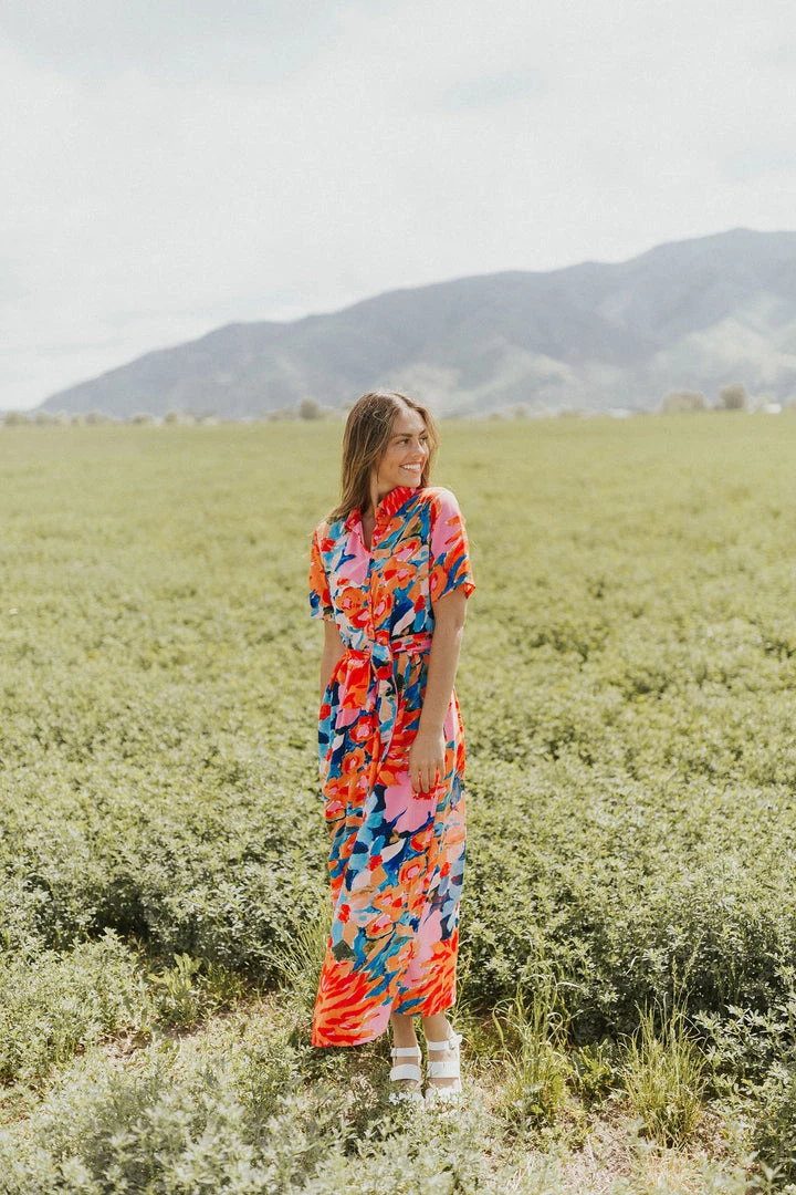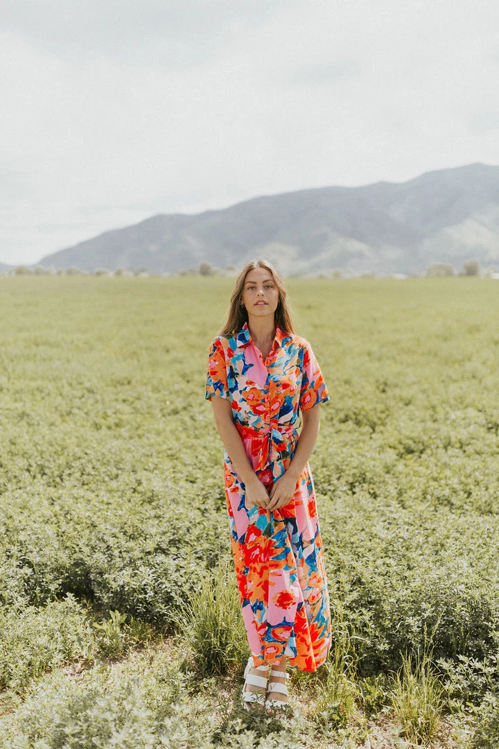 Tropical floral maxi dress. Removable tie at waist. Button down front. Nursing friendly!