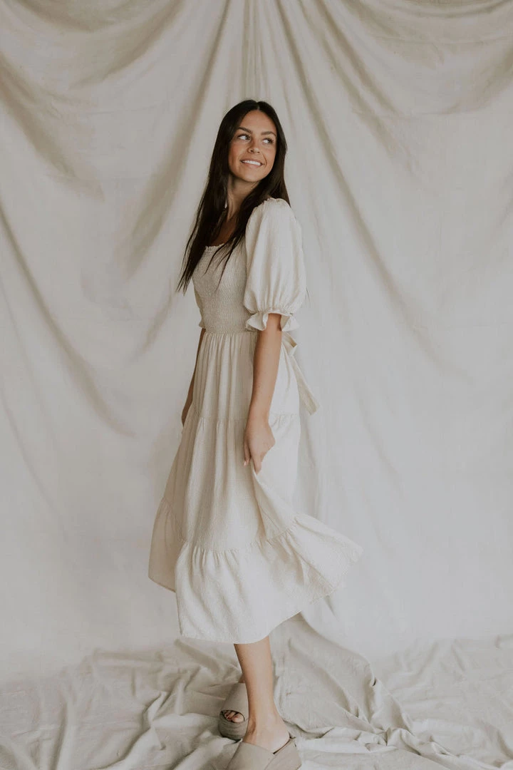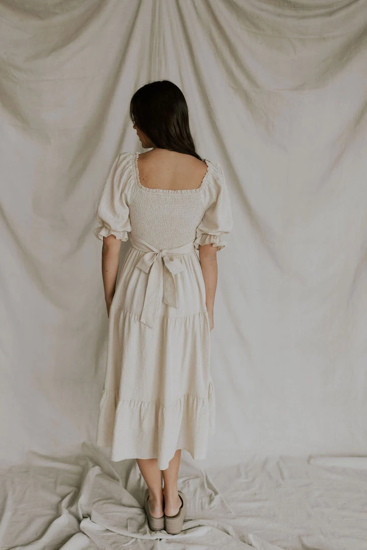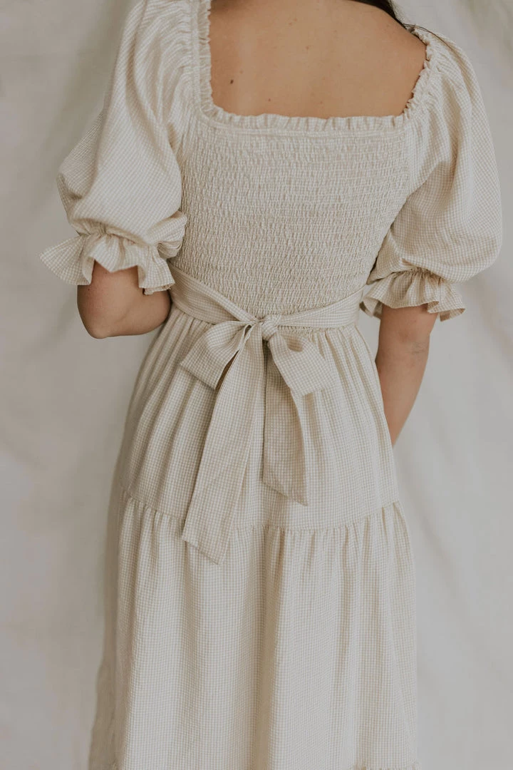 Square neck gingham midi. Elastic sleeves can be worn on or off the shoulder. Puff sleeves with ruffle detail. Side pockets. Tiered skirt with lining. Tie in back. Available in multiple colors.  Nursing friendly!