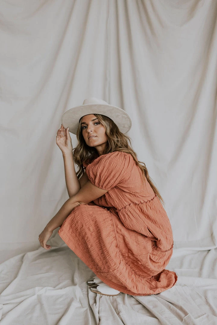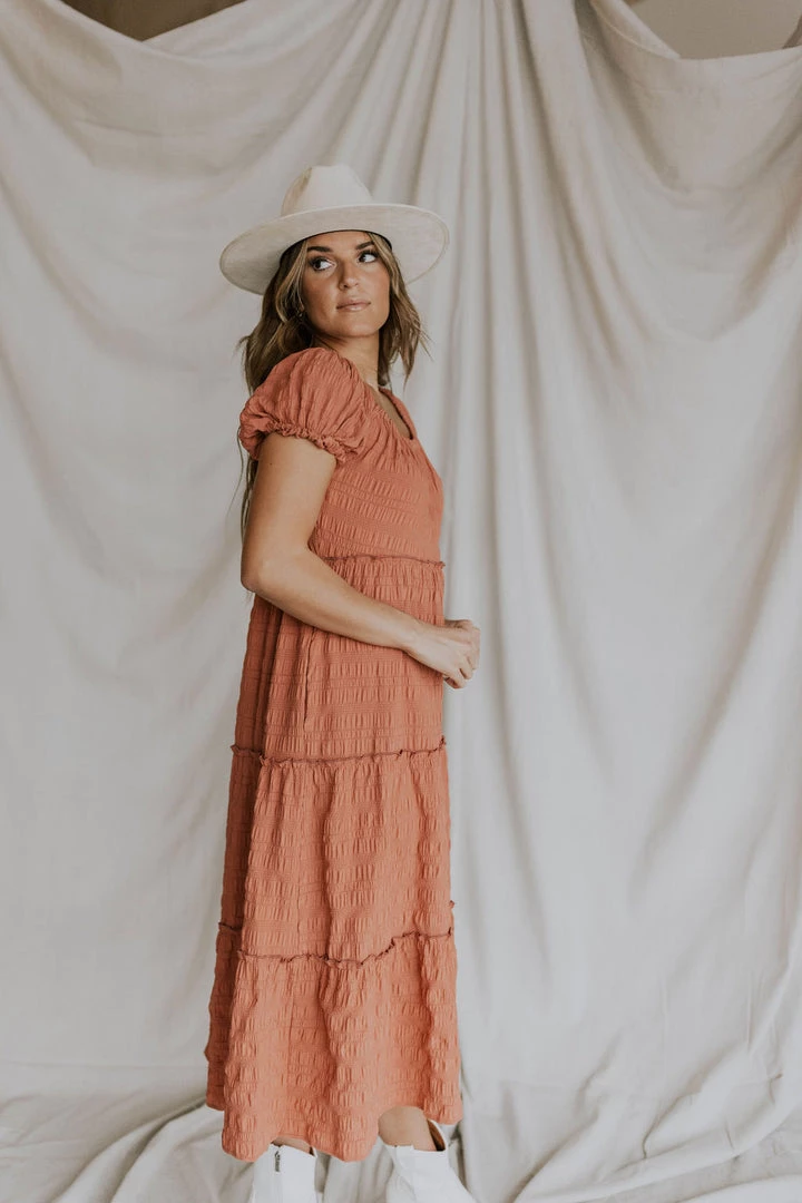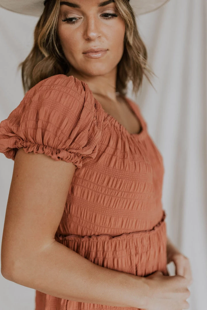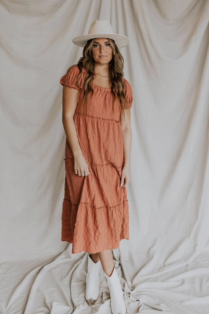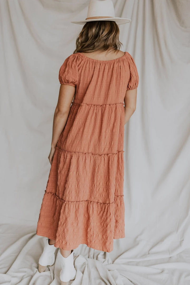 Textured grid fabric midi. ruffle detail throughout skirt. Wide elastic neckline can be worn on or off the shoulder. Available in multiple colors.  Nursing friendly!