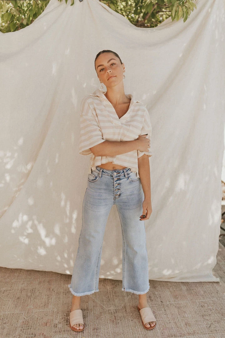 High rise button fly cropped jeans. Stretchy and sturdy denim. Frayed cropped hem.