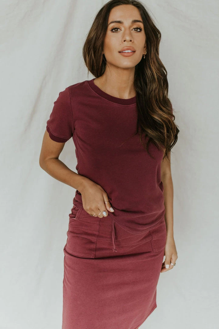 Soft washed look and feel top. Plenty of stretch. Ribbed neck and arms. Available in multiple colors. Pair perfectly with the Everyday Skirt in Plum.