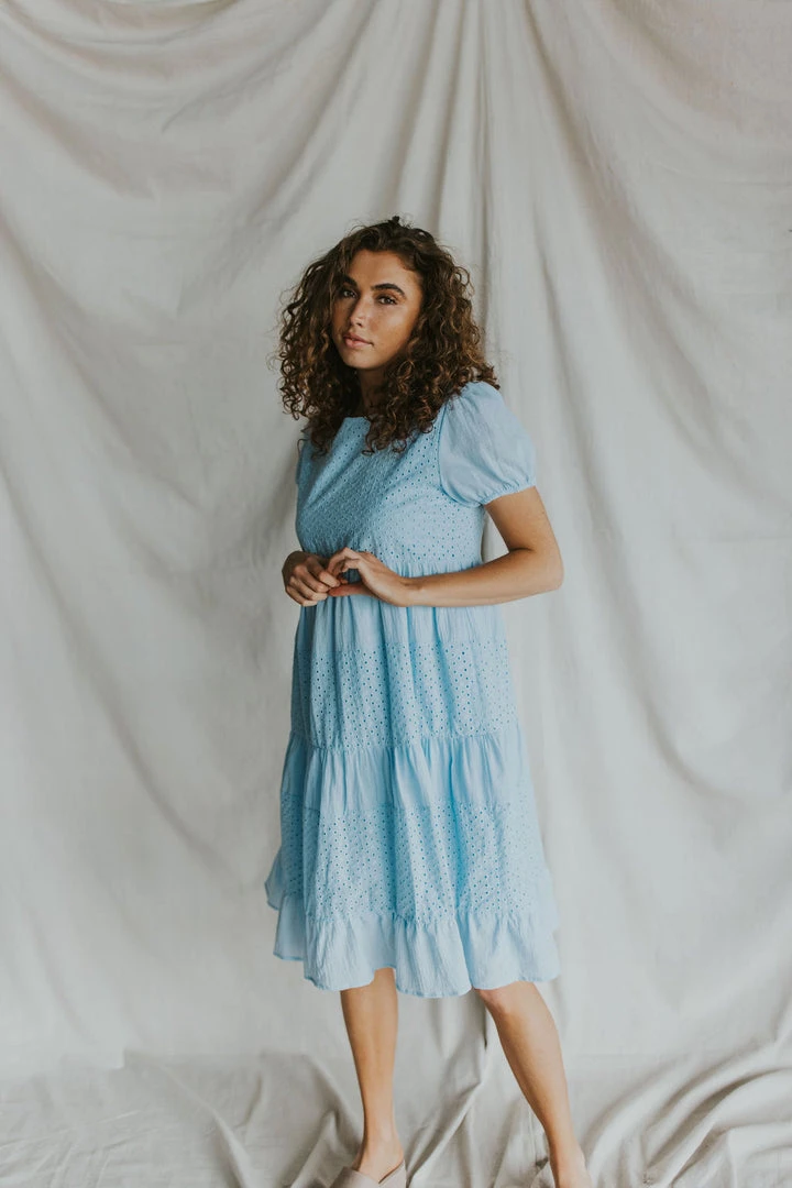 Eyelet lace tiered midi. Single button closure in back. Soft gauze fabric. Available in multiple colors. Â