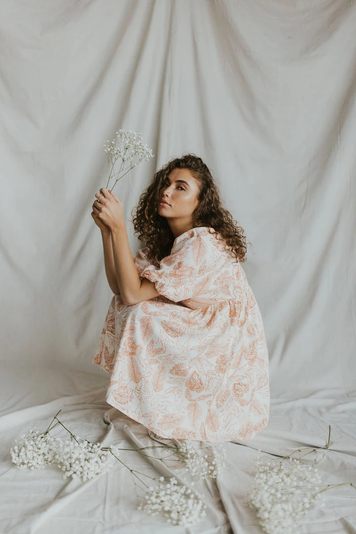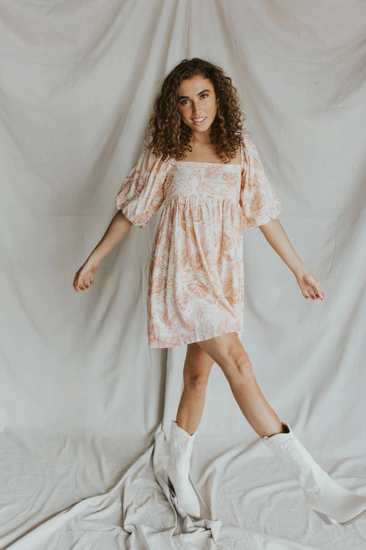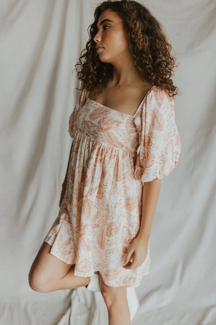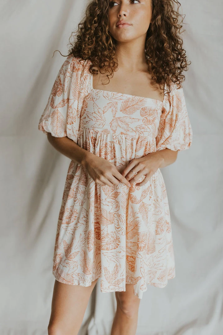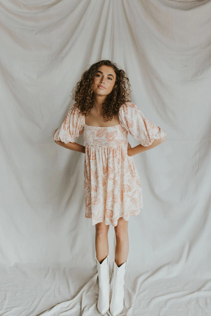 Coral leaf print mini dress in cream. Puff sleeves. Square neck with pleated waist line. Elastic back. Fully lined.