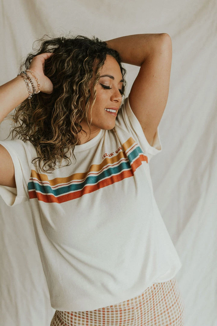 Graphic tee in cream. ‘Feelin’ Good’ printed on front with retro stripes. Soft washed look and feel. Cuffed sleeves.