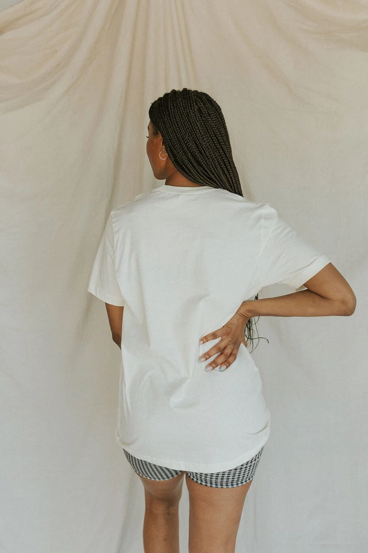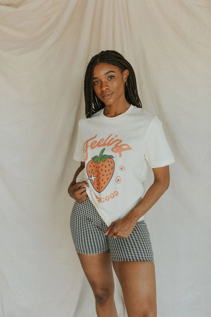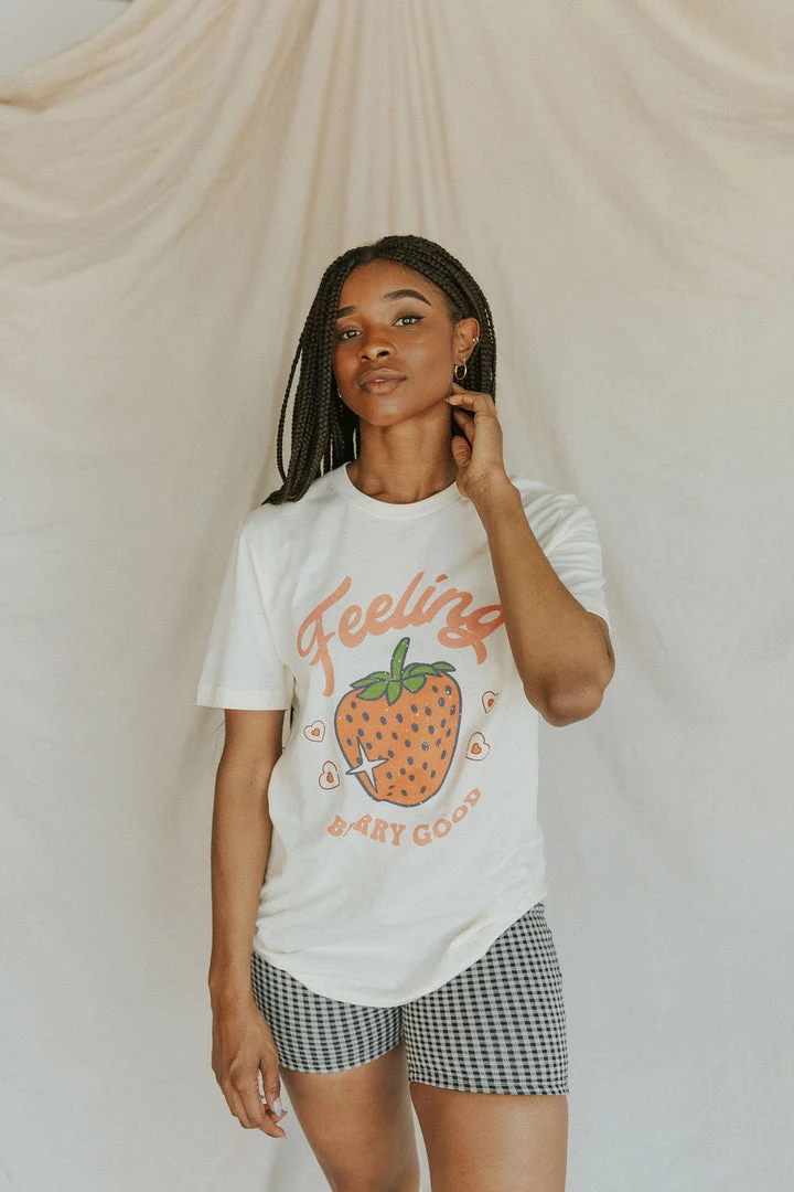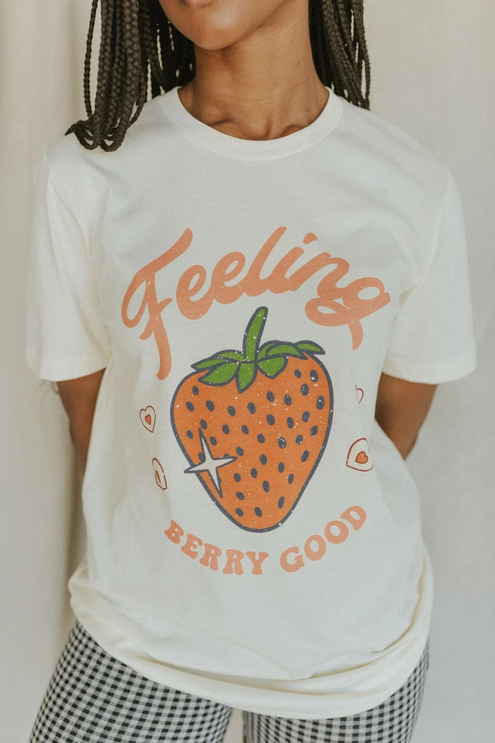 Graphic print tee. Graphic print of ‘Feeling Berry Good’ on front. Soft ivory washed tee.