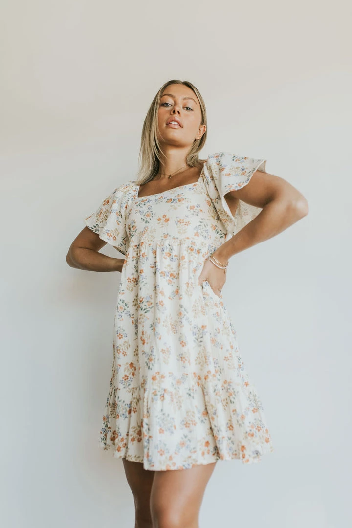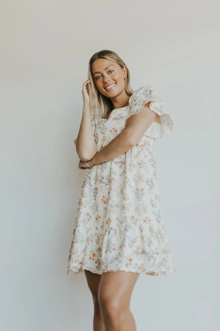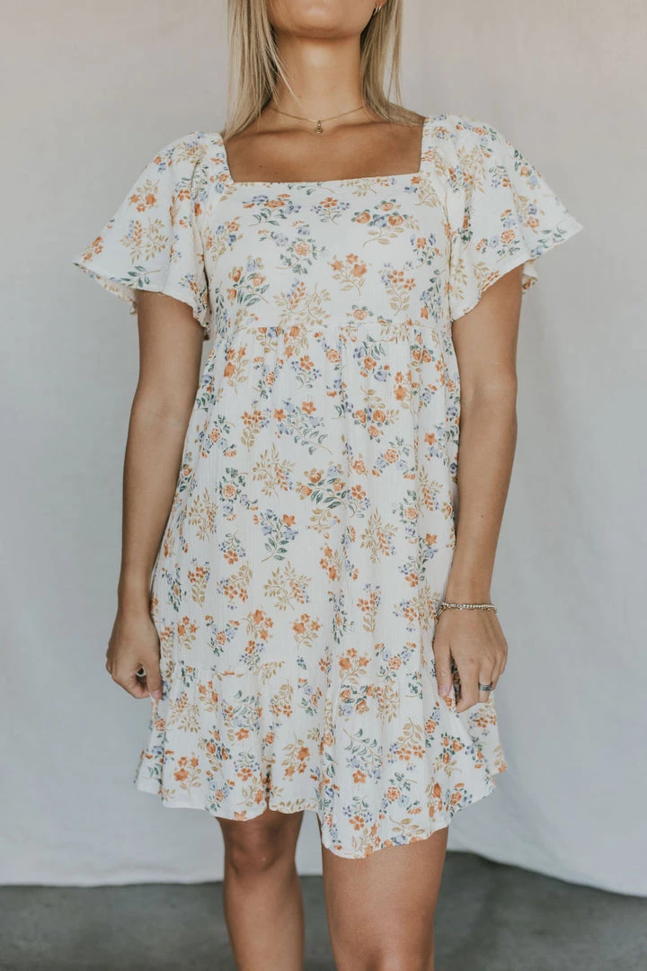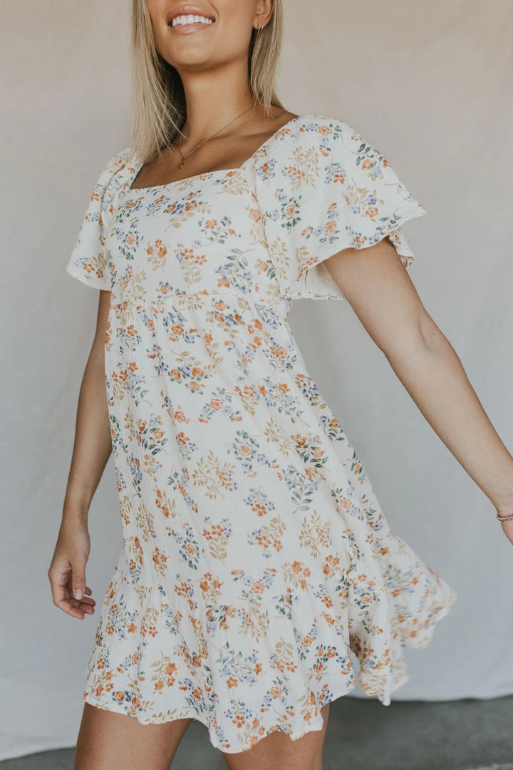 Soft gauze dress in ivory with floral print. Square neck with elastic shoulders. Smocked back for added fit. Side zipper. Dress lined. Ruffle skirt detail