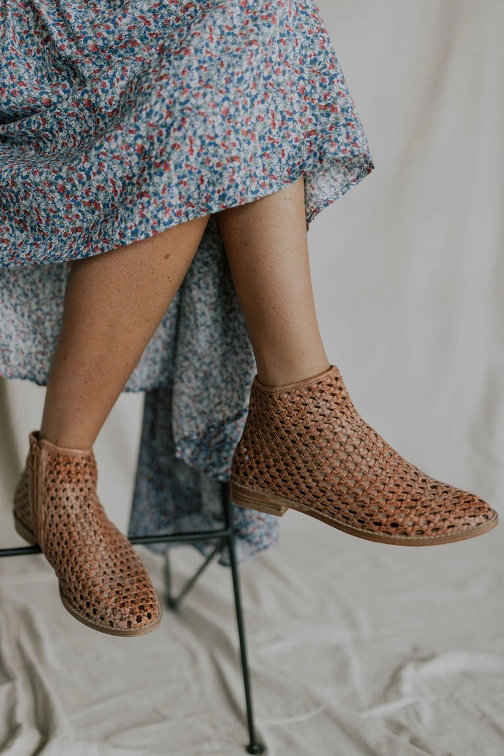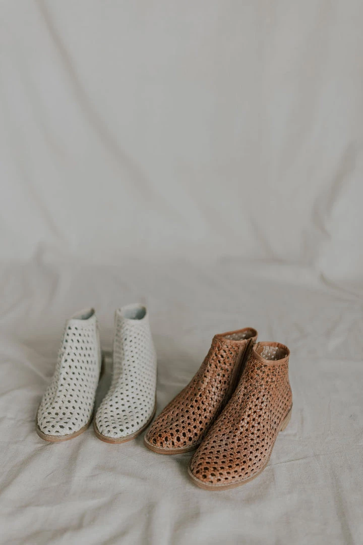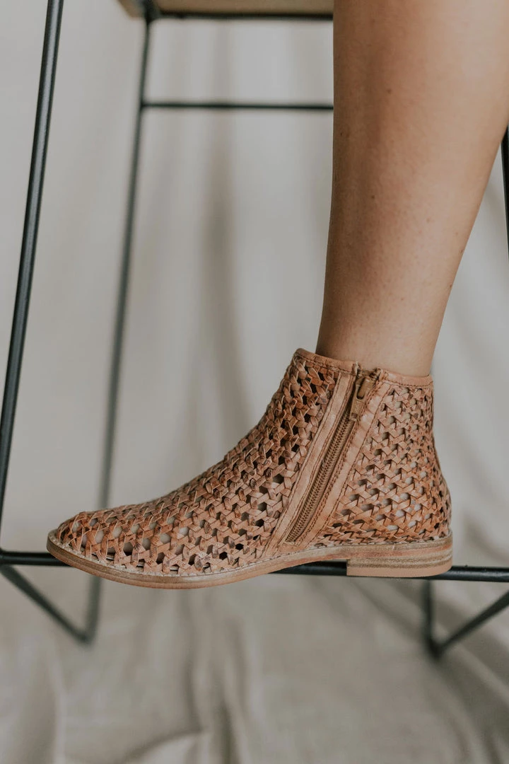 Give your shoe collection a refresh with these effortlessly cool and breathable boots featured in an ankle-style and buttery soft leather with woven details allover, a side zip closure, and subtle pointed toe. MSRP $148