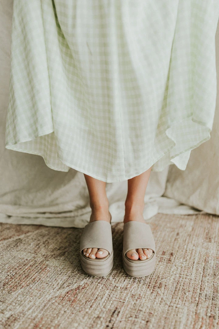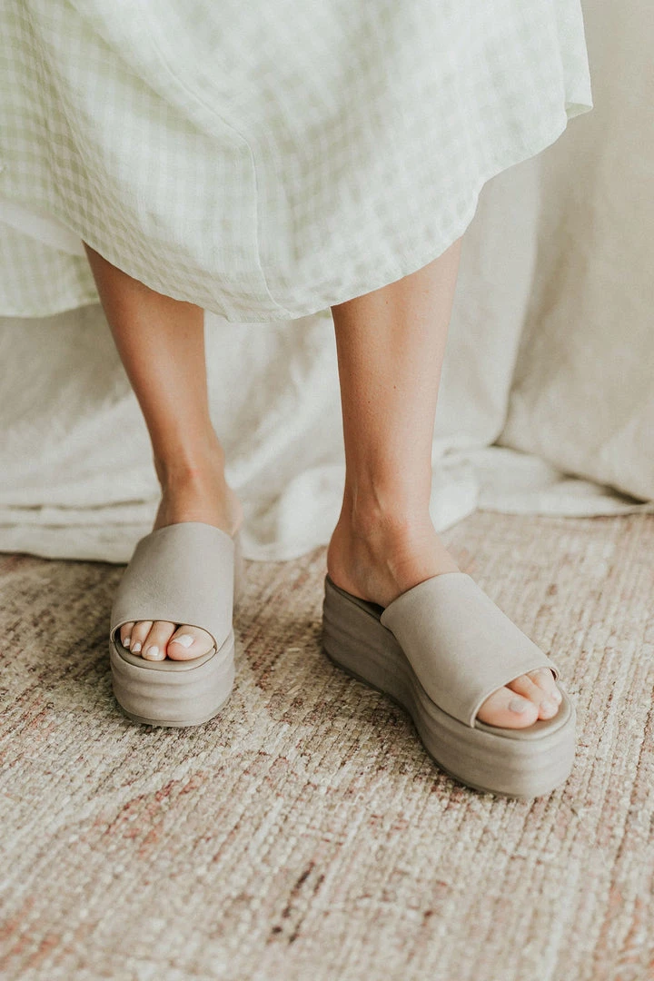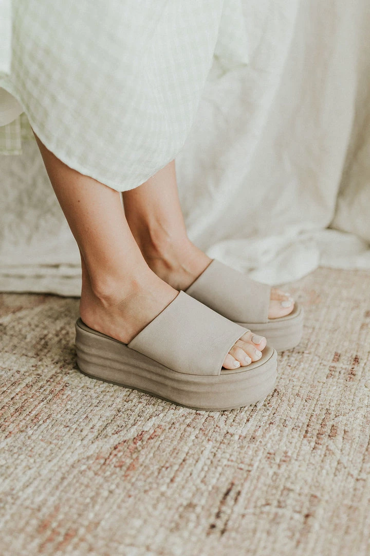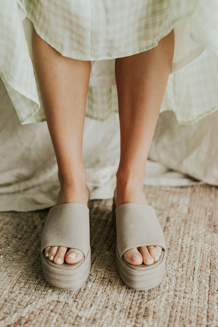 Genuine leather mule with platform heel. 2.5″ heel. A mule design with a textured flatform sole.