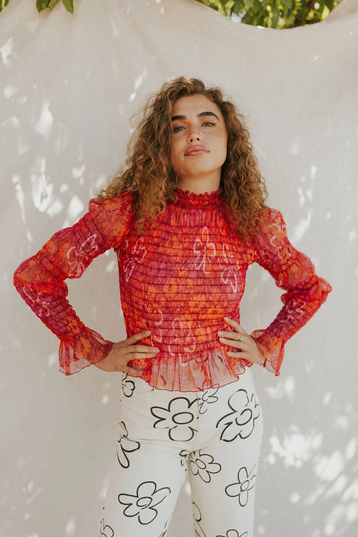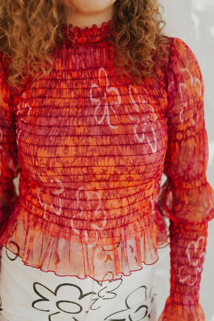 Turn heads in sheer and stunning top, featured in a high-neck silhouette with smocked detailing throughout and ruffle detailing at the sleeves for added dimension. MSRP $88