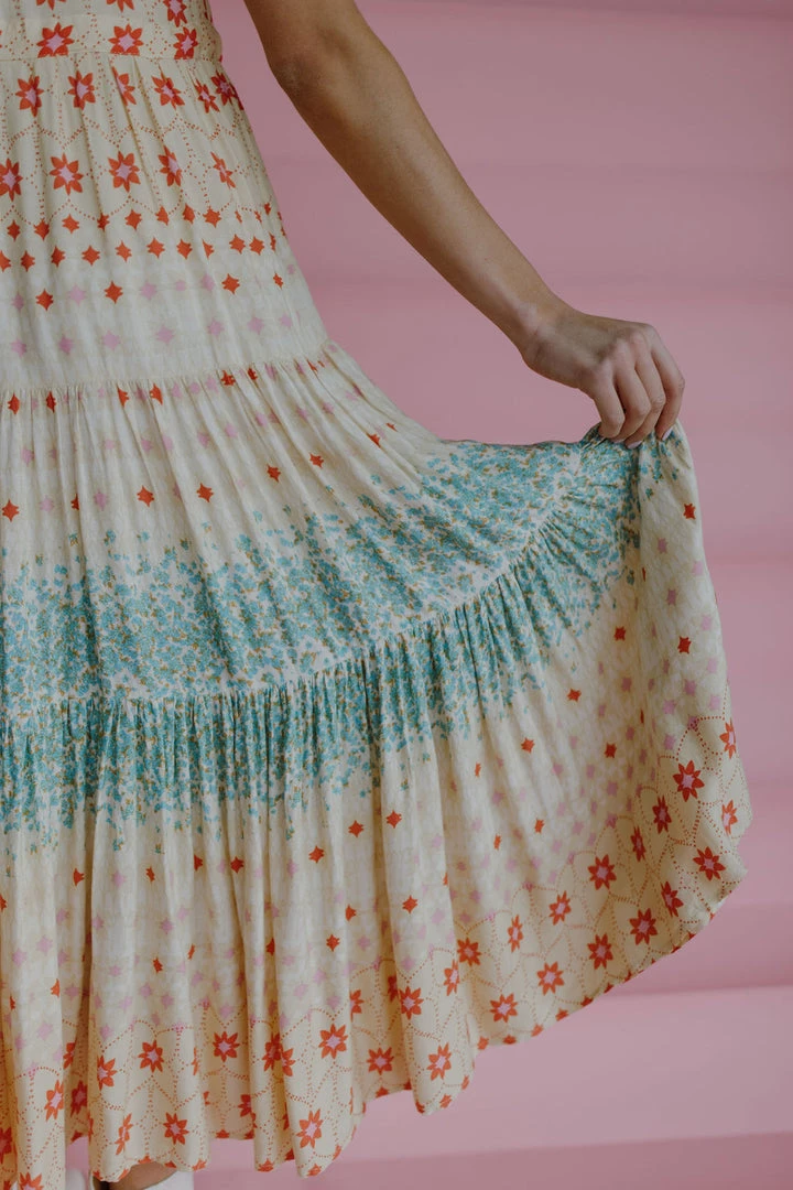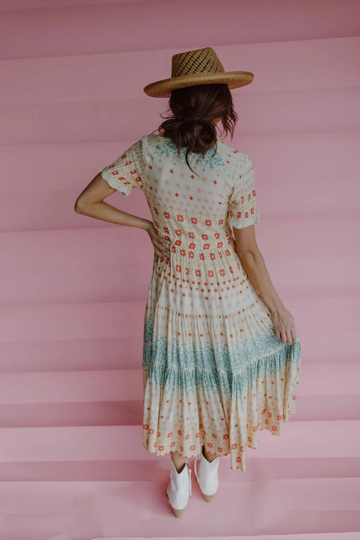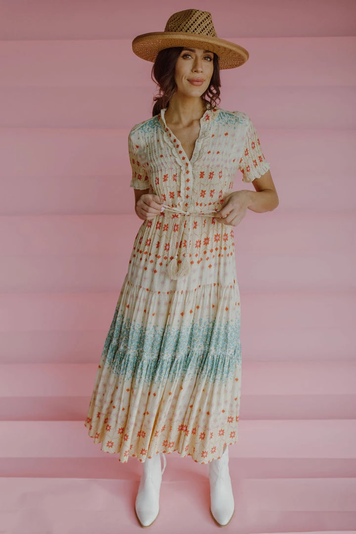 Effortless floral print maxi dress featured in an A-line silhouette with a tiered pleated skirt, button-up neckline and ruffled trim. MSRP $148 Nursing friendly!