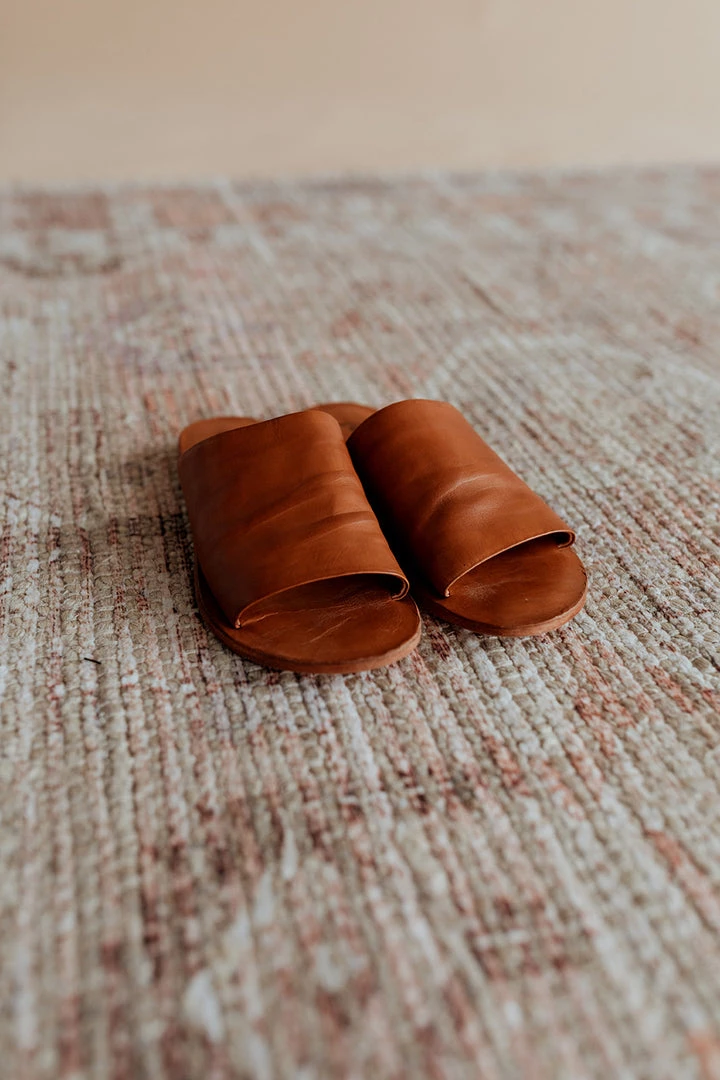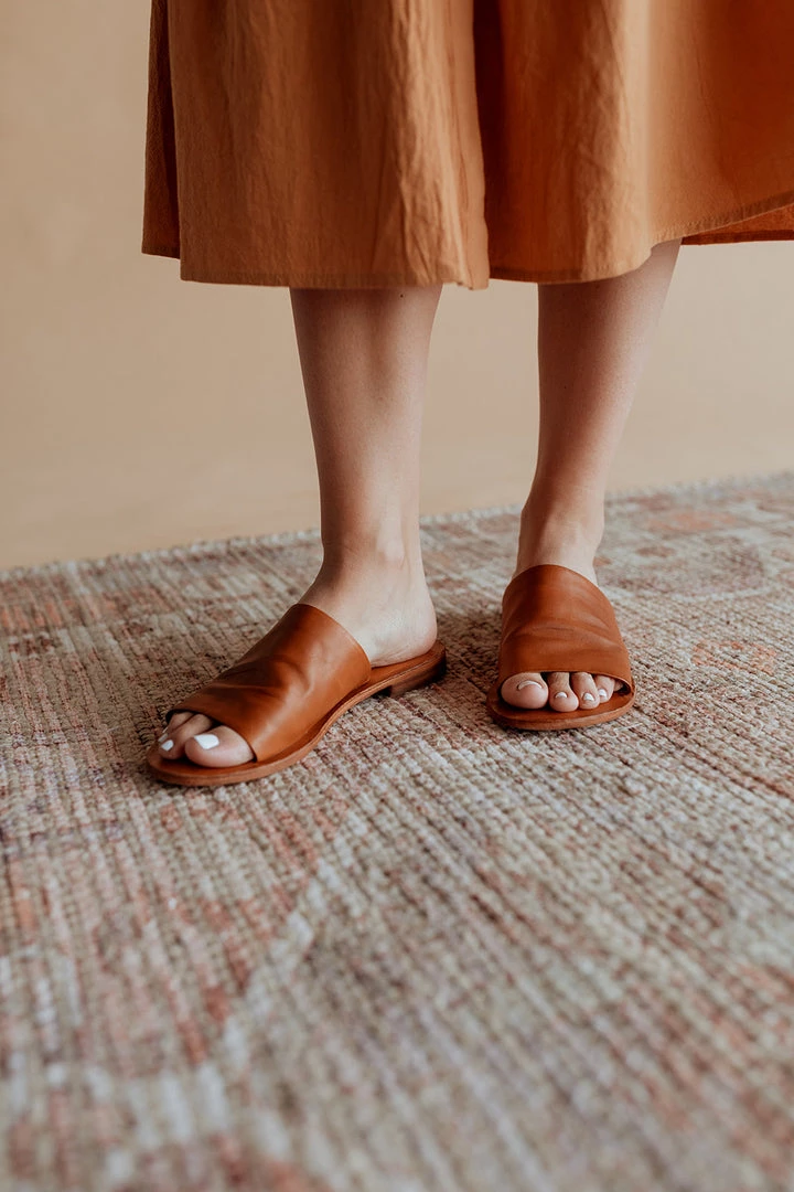 Genuine leather slide in cognac leather. Soft footbed. Short stacked heel. MSRP $78