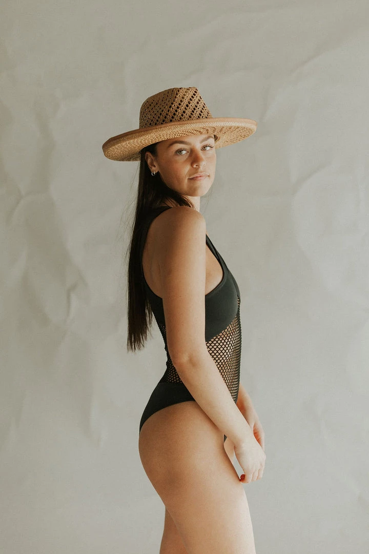 Criss cross one piece in black. Mesh body. Zipper in back. No padding or bra pads.