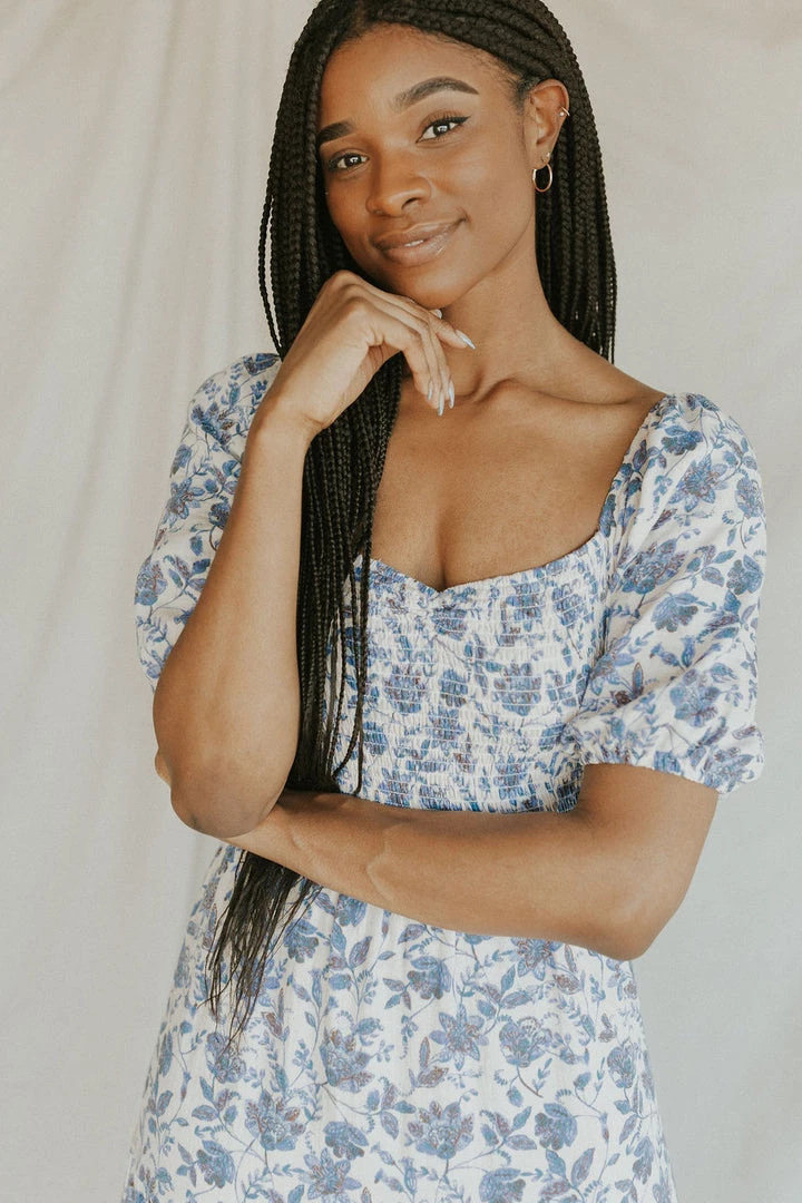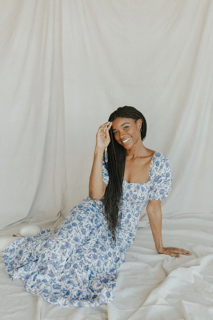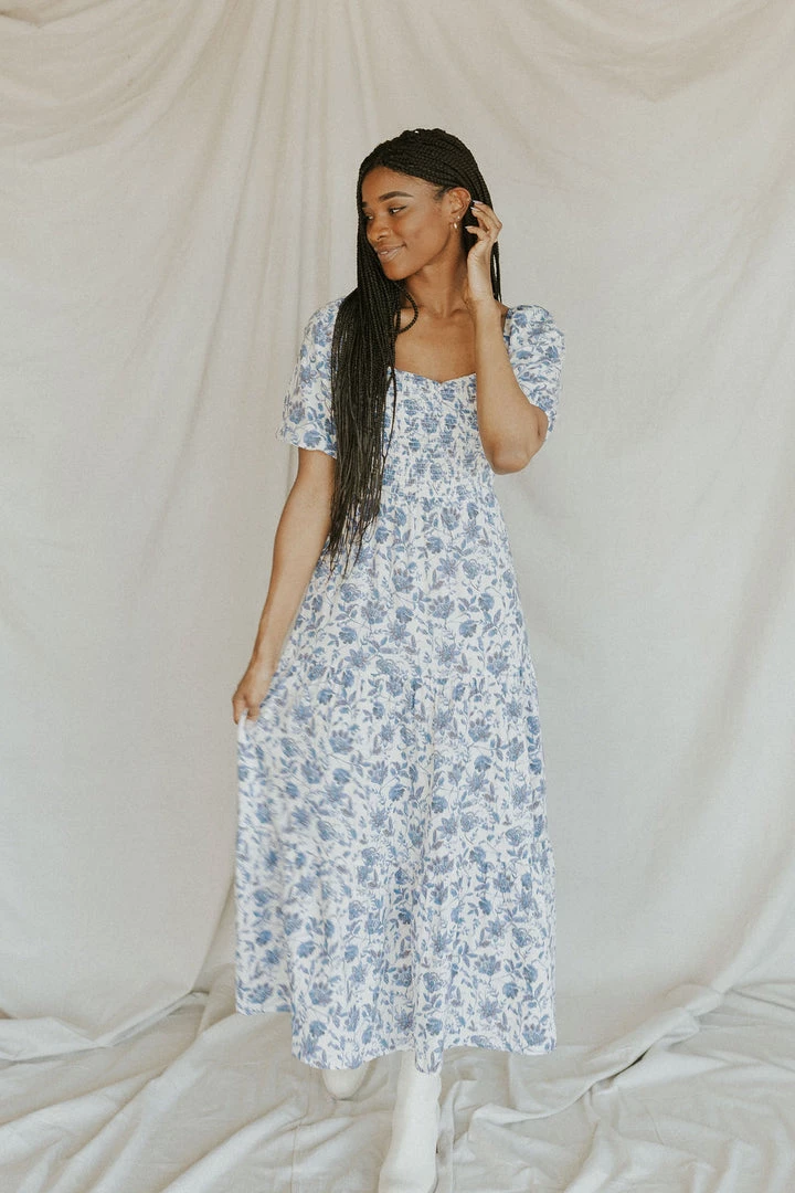 Floral maxi. Smocked body. Elastic sleeves can be worn on or off the shoulder. Puff sleeves with tiered skirt.  Nursing friendly!