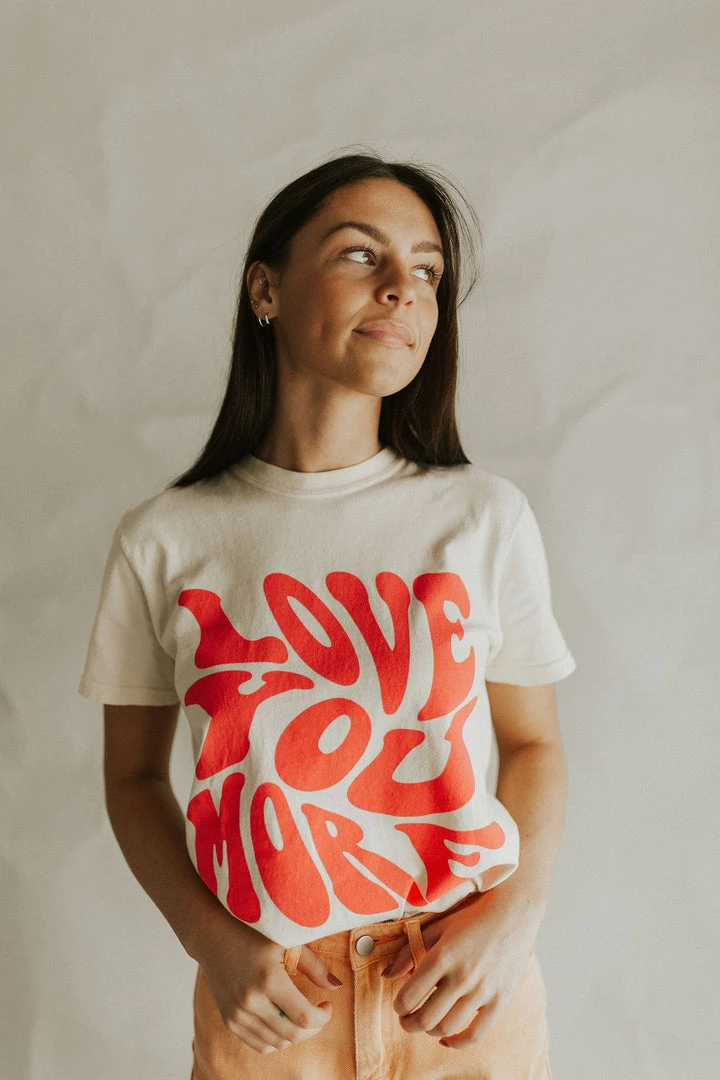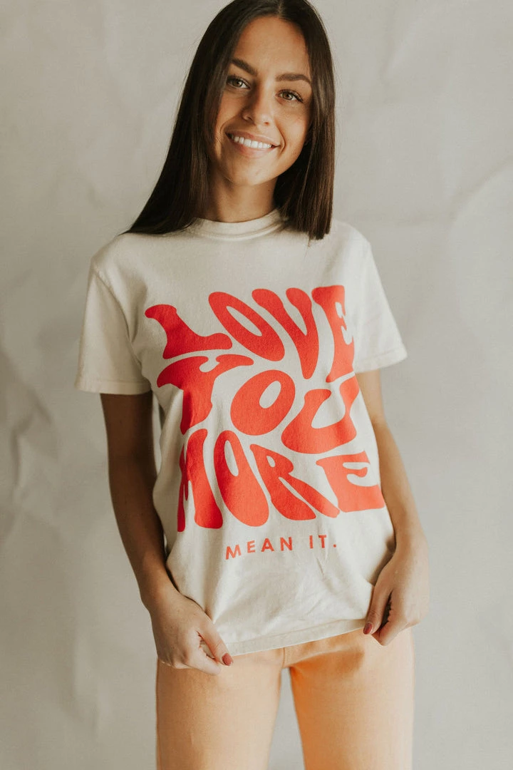 Graphic tee with bright pink ‘Love You More… Mean It’ on front. Soft washed look and feel.