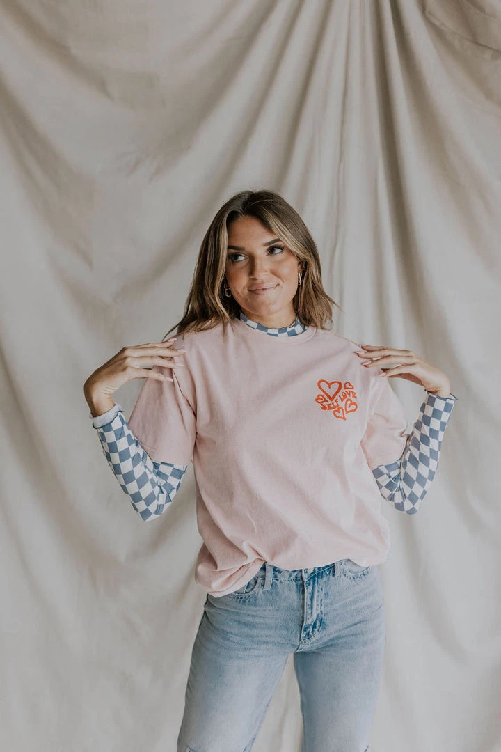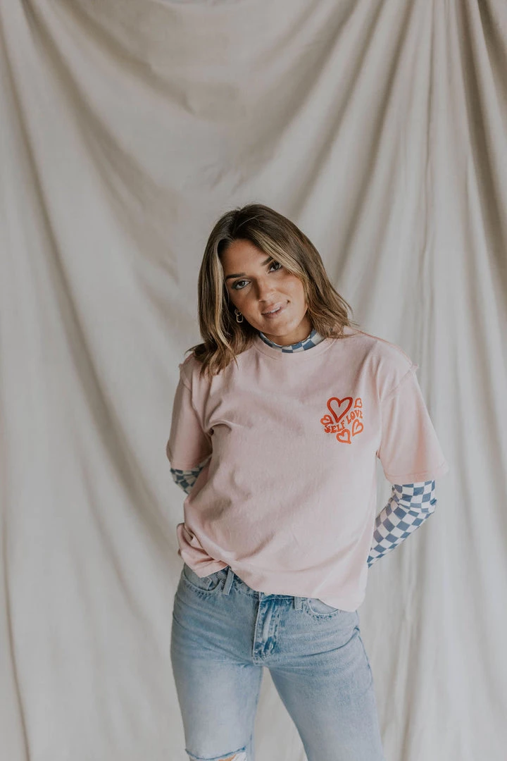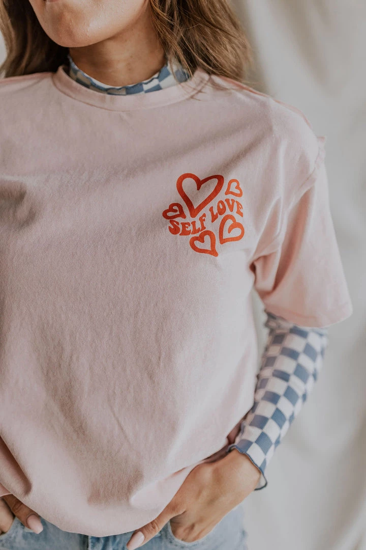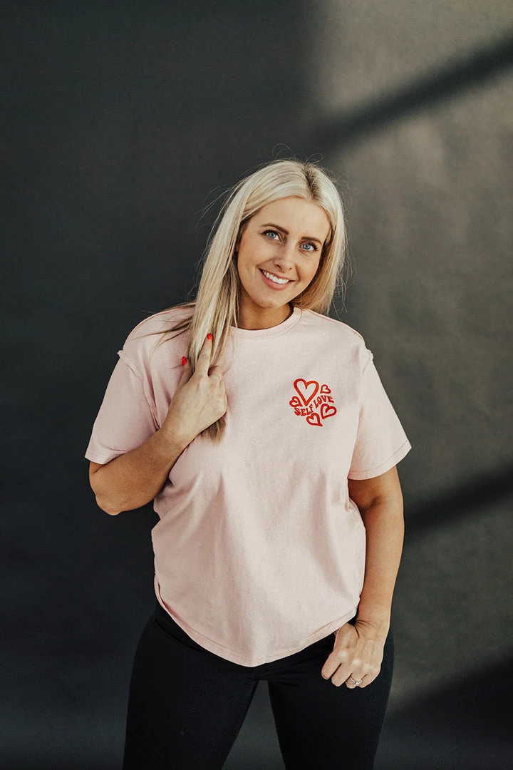 Graphic tee with red ‘Self Love Club’ on front and back. Raw hem seam detail.