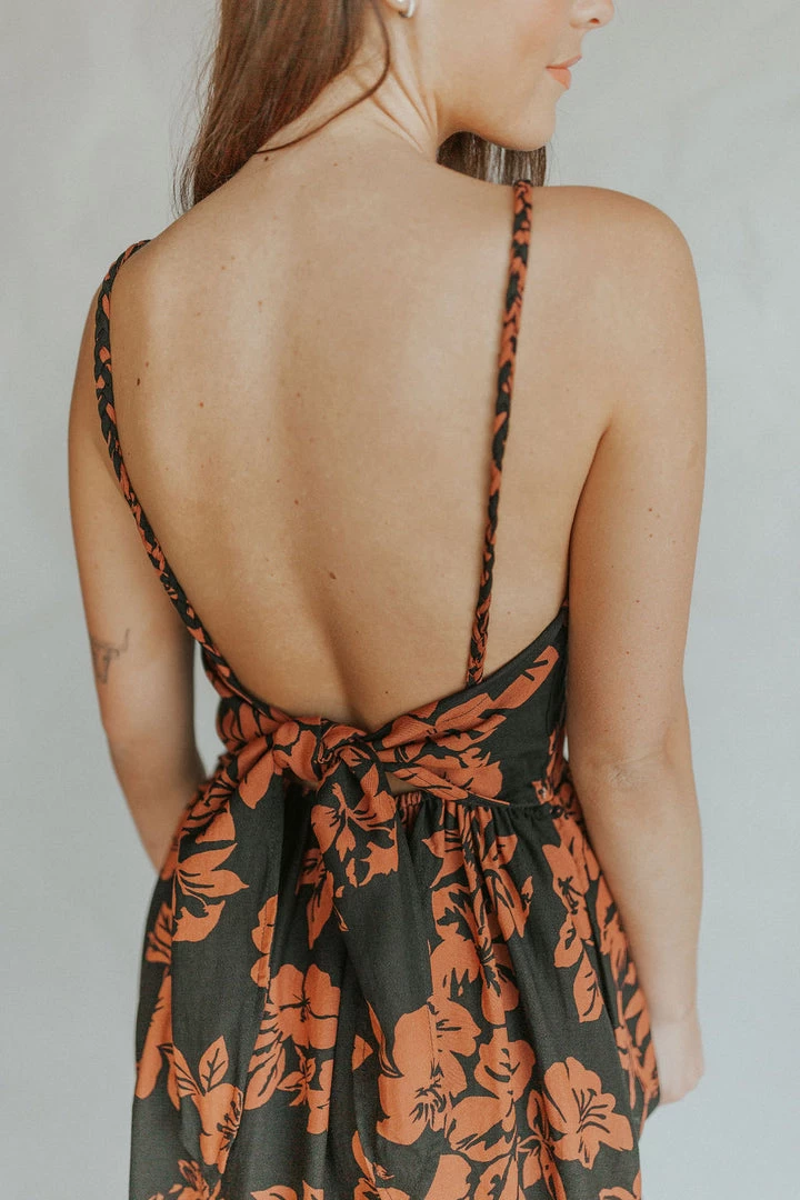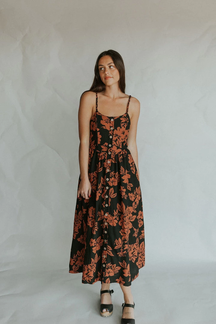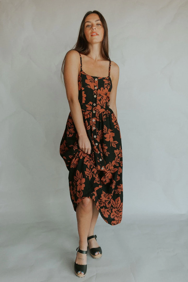 Floral midi. Elastic back waist. Wood button front. Side pockets. Open back with braided straps and large back tie. Skirt lined. Black with rust hibiscus floral print. Nursing friendly!