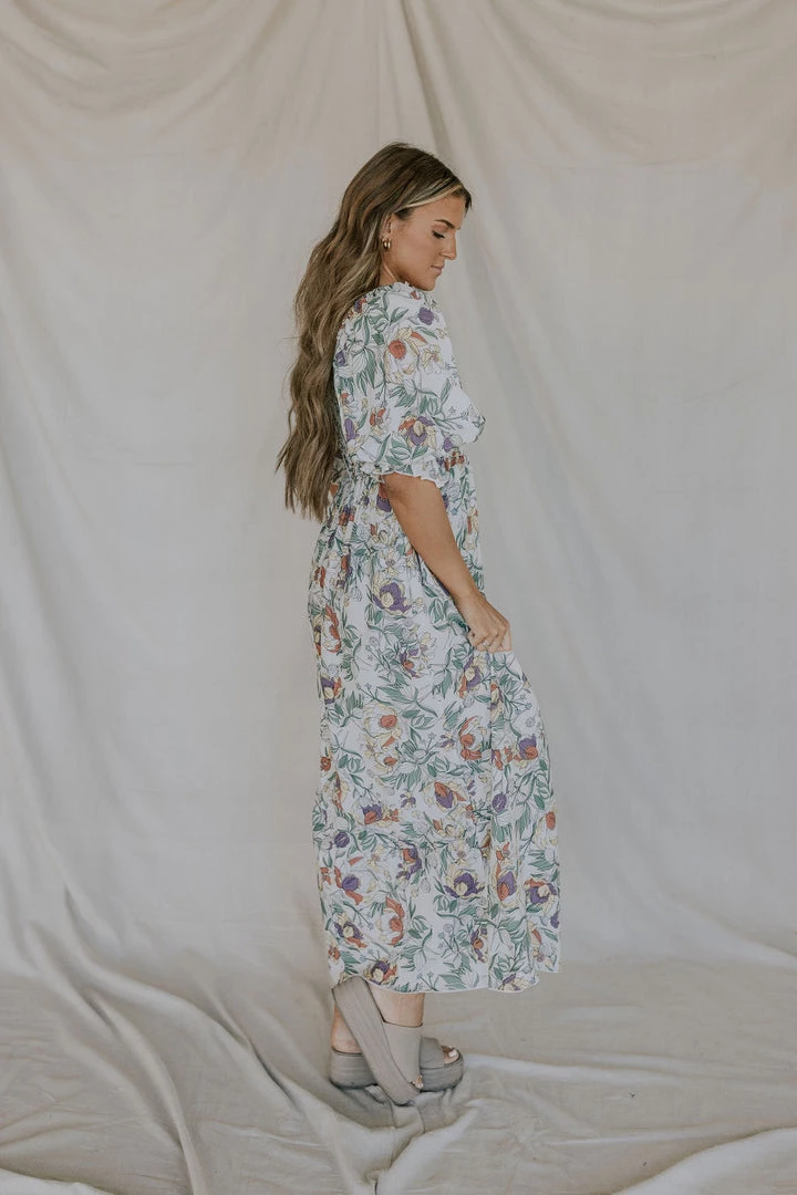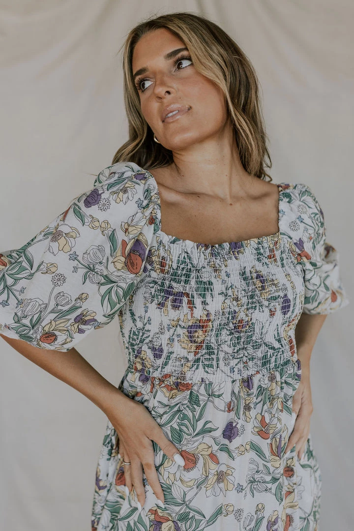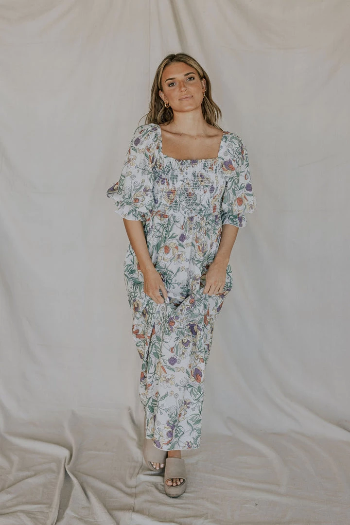 Floral maxi in white. Puff sleeves with elastic shoulders. Can be worn on or off the shoulder. Side pockets. MADE IN THE USA!!Â