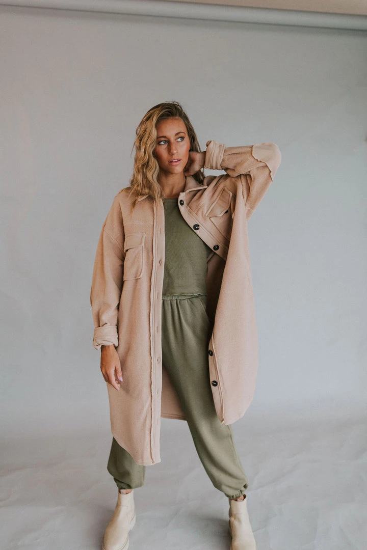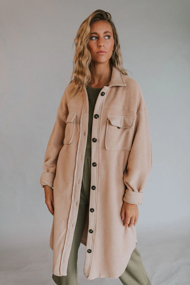 Long fleece button up jacket. Large buttons with chest pockets. Side pockets are stitched shut but may be unstitched if pocket is desired. Raw hem detail.