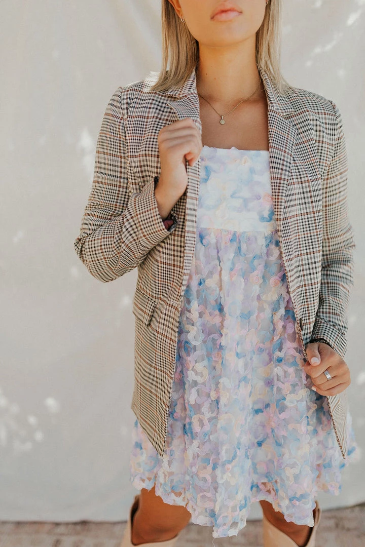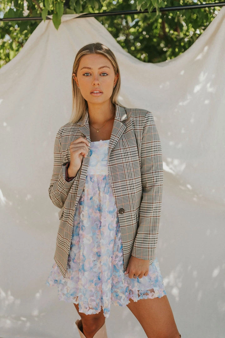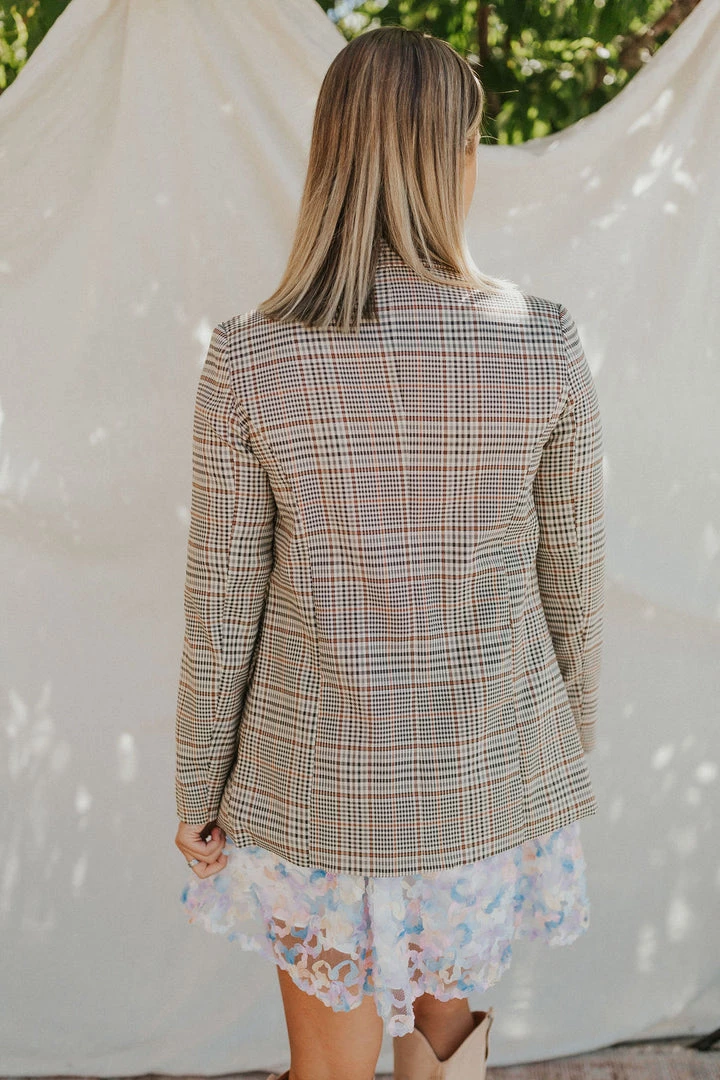 Plaid blazer. Single button closure. Stitched closed front pockets. Silky liner.