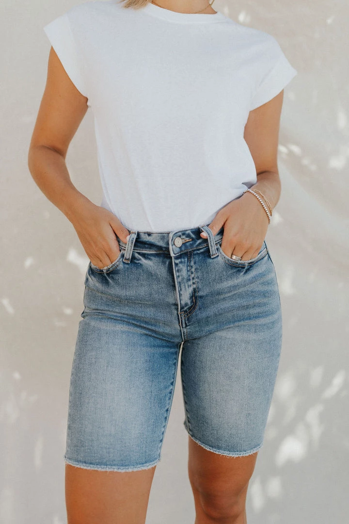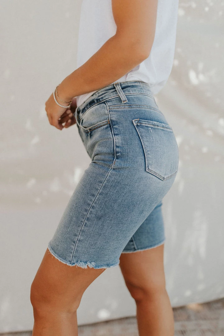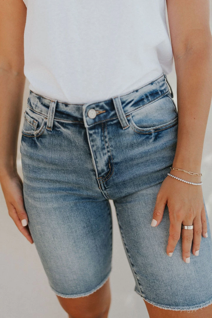 High rise cut off bermudas. Sturdy denim with good soft stretch. Raw hem detail. Zipper fly.